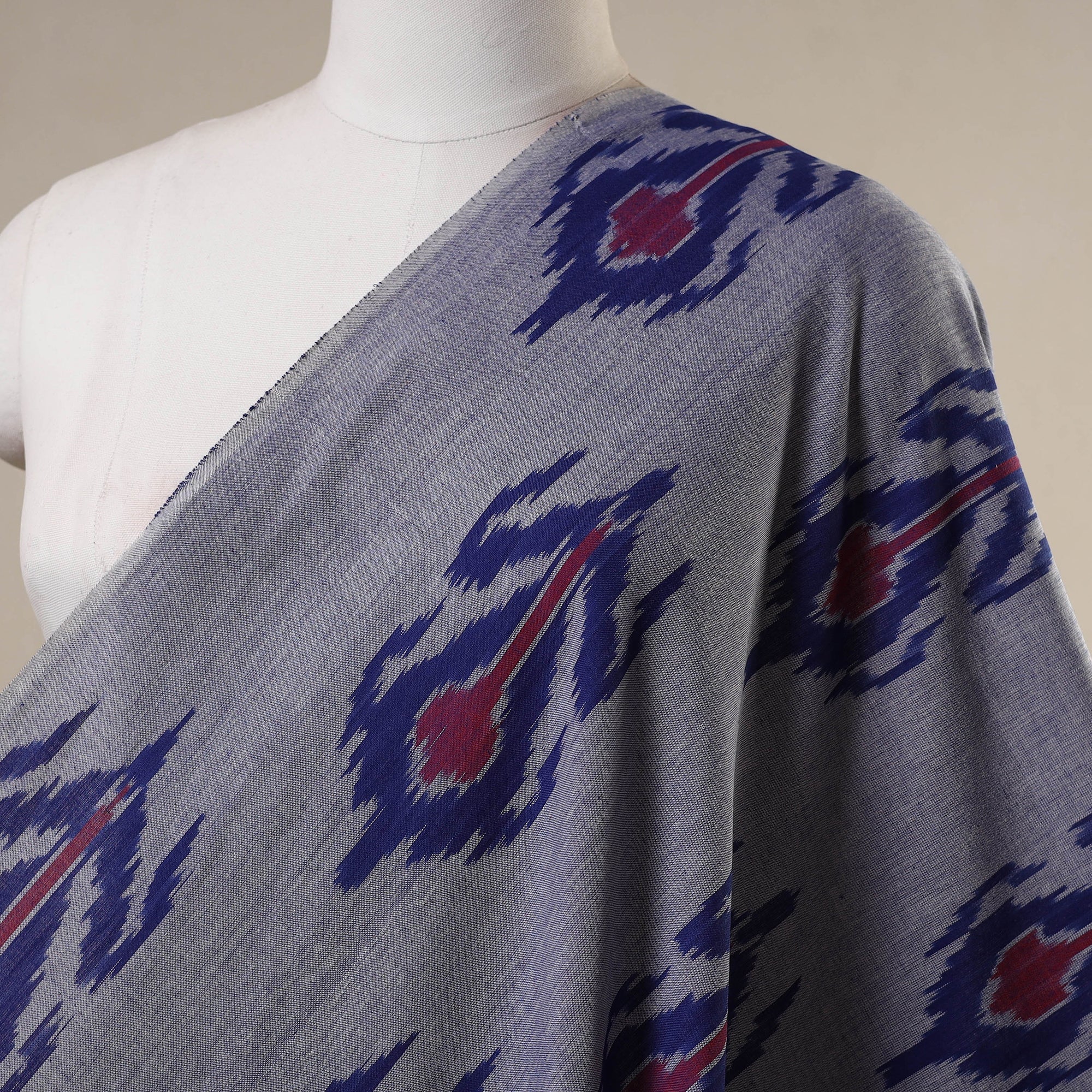 This blue cotton pochampally central asian ikat fabric is woven in Telangana using the traditional ikat dyeing method, where both warp and weft threads are dyed before weaving. The result is clean, geometric patterns with a rich colors. Lightweight and versatile, this fabric is suitable for kurtas, dresses, dupattas, or even home decor projects. A blend of pochampally’s heritage and central asian-inspired motifs, it brings a timeless appeal to any design.