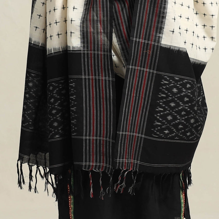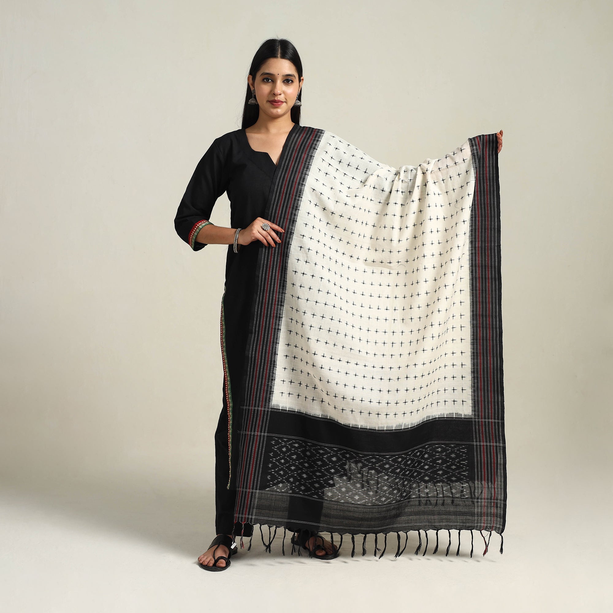 This handloom cotton white pochampally double-ikat dupatta with tassels is meticulously crafted by skilled artisans in Telangana.. Ikat (Ikkat) is a traditional dyeing technique that uses a resist dyeing process, similar to tie-dye, on either the warp or weft fibers before weaving. Known for its intricate patterns and rich texture, this dupatta is ideal for festive wear, casual outings, or elevating your everyday attire with timeless craftsmanship.