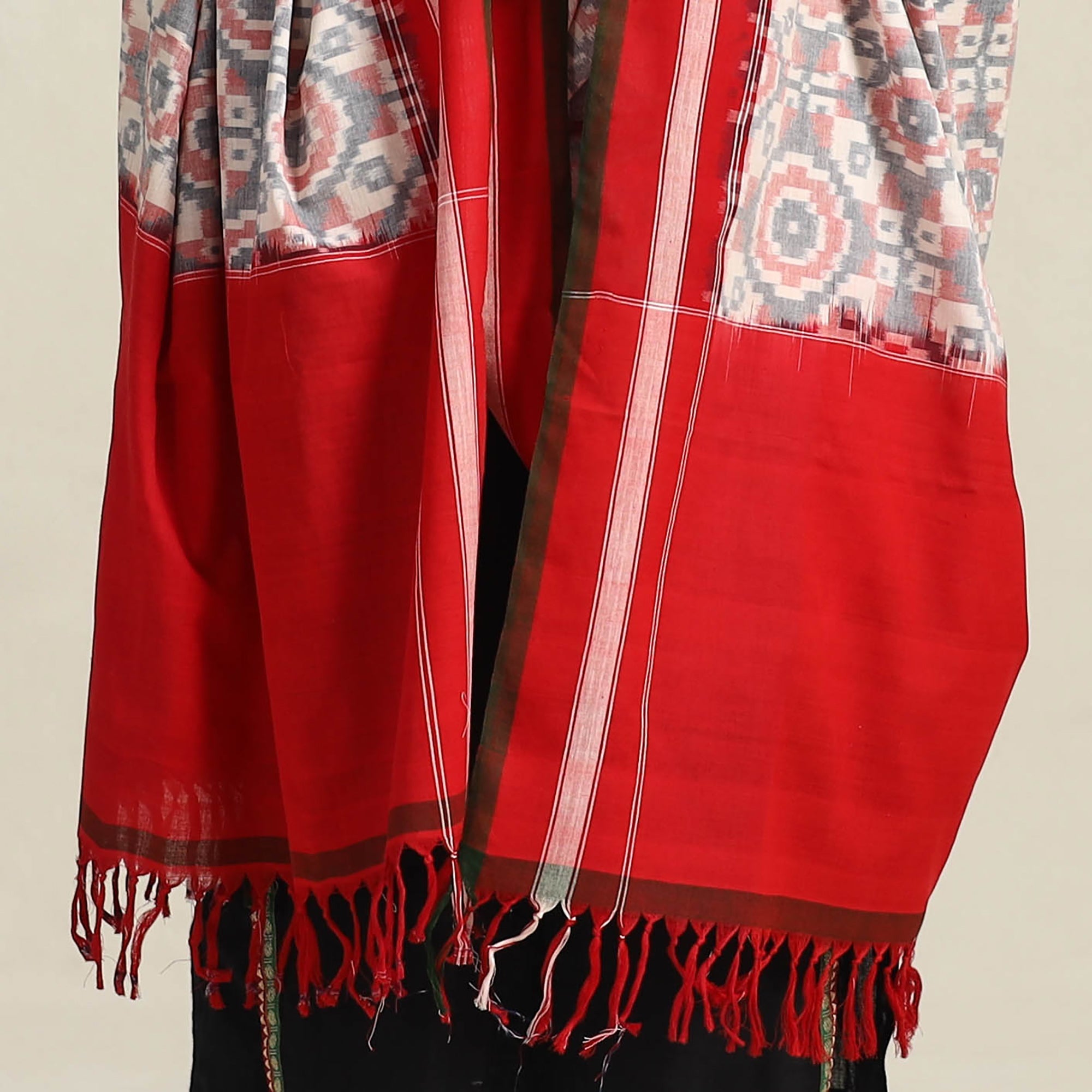 This handloom cotton grey pochampally double-ikat dupatta with tassels is meticulously crafted by skilled artisans in Telangana.. Ikat (Ikkat) is a traditional dyeing technique that uses a resist dyeing process, similar to tie-dye, on either the warp or weft fibers before weaving. Known for its intricate patterns and rich texture, this dupatta is ideal for festive wear, casual outings, or elevating your everyday attire with timeless craftsmanship.