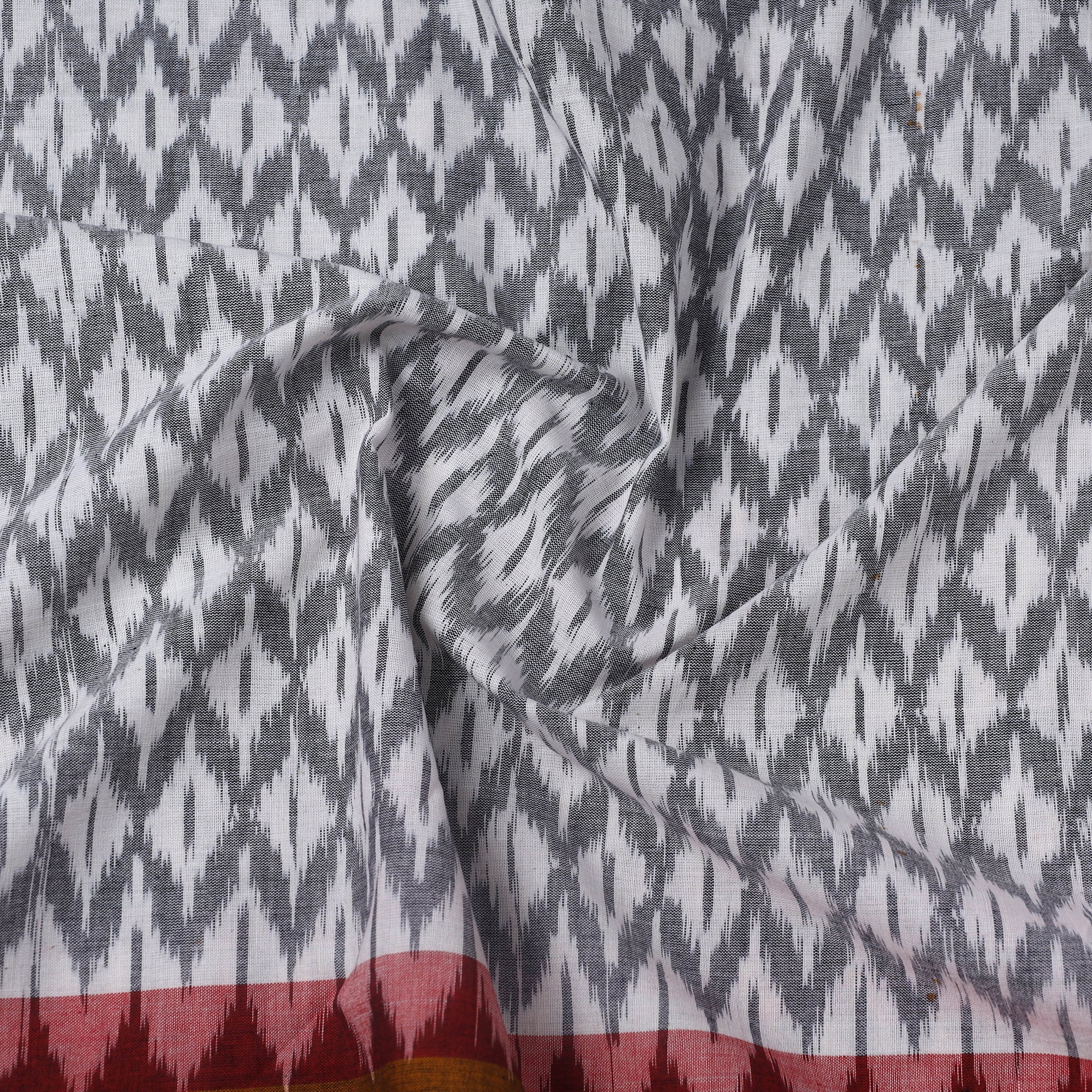 Fine-quality white handloom cotton pochampally Ikat fabric with a border from Telangana. Ikat (or Ikkat) is a dyeing technique used to create intricate patterns on textiles through a resist-dyeing process, similar to tie-dye, applied to either the warp or weft fibers before weaving. Ikat fabrics feature stunning patterns and are world-famous for their exquisite colors, textures, and designs. Perfect for both traditional and modern projects. This piece carries tiny knots, thread pulls, or uneven lines — not flaws, but fingerprints. Every irregularity is a whisper from the hands that made it. It’s what happens when tradition weaves through time, not machines. If you’re looking for perfection, this isn’t it. But if you’re looking for soul — you’ve found it.