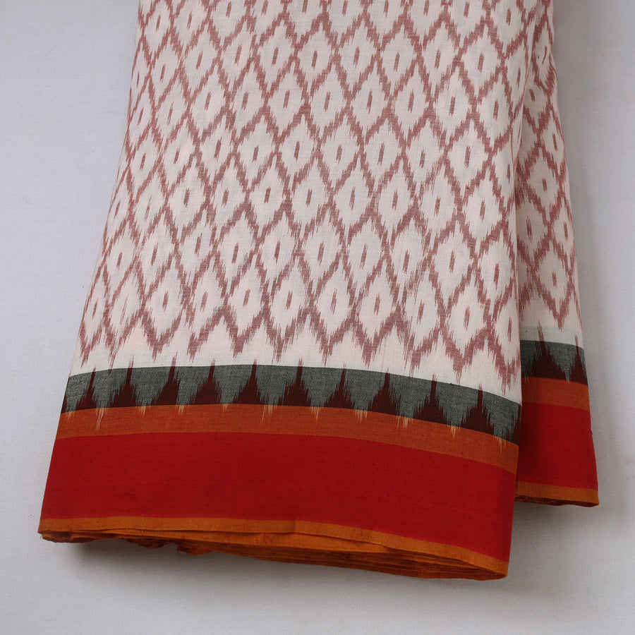 Fine-quality beige handloom cotton pochampally Ikat fabric with a border from Telangana. Ikat (or Ikkat) is a dyeing technique used to create intricate patterns on textiles through a resist-dyeing process, similar to tie-dye, applied to either the warp or weft fibers before weaving. Ikat fabrics feature stunning patterns and are world-famous for their exquisite colors, textures, and designs. Perfect for both traditional and modern projects. This piece carries tiny knots, thread pulls, or uneven lines — not flaws, but fingerprints. Every irregularity is a whisper from the hands that made it. It’s what happens when tradition weaves through time, not machines. If you’re looking for perfection, this isn’t it. But if you’re looking for soul — you’ve found it.