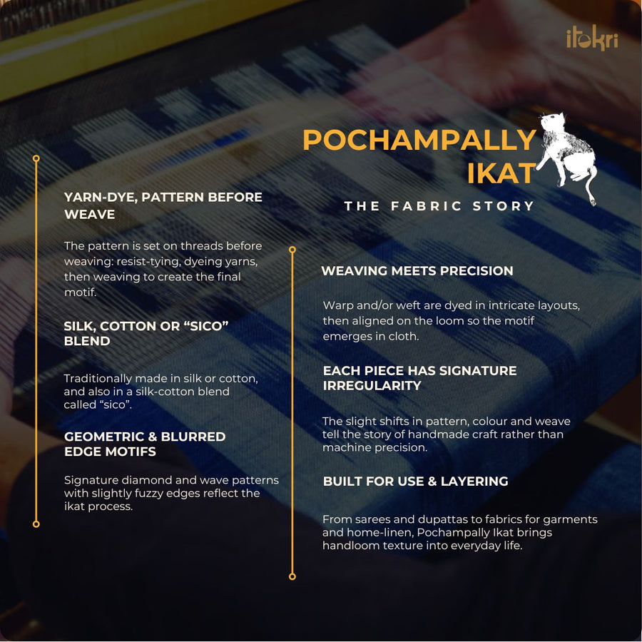 Pochampalli Ikat is a type of ikat produced in the city of Bhoodan Pochampally, Telangana Province. This absolutely beautiful fabric features traditional geometric patterns in a unique washed design and has a nice old-world charm.