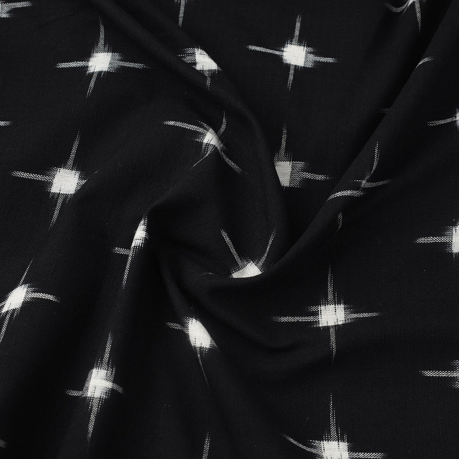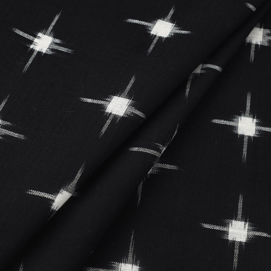 Fine quality black handloom cotton pochampally double ikat fabric from Telangana. Ikat (Ikkat) is a dyeing technique used to pattern textiles through a resist dyeing process similar to tie-dye on either the warp or weft fibers prior to dyeing. Ikat has lovely patterns and are world famous for their extremely beautiful colors, texture and designs. Perfect for both traditional and modern projects. This piece carries tiny knots, thread pulls, or uneven lines — not flaws, but fingerprints. Every irregularity is a whisper from the hands that made it. It’s what happens when tradition weaves through time, not machines. If you’re looking for perfection, this isn’t it. But if you’re looking for soul — you’ve found it.