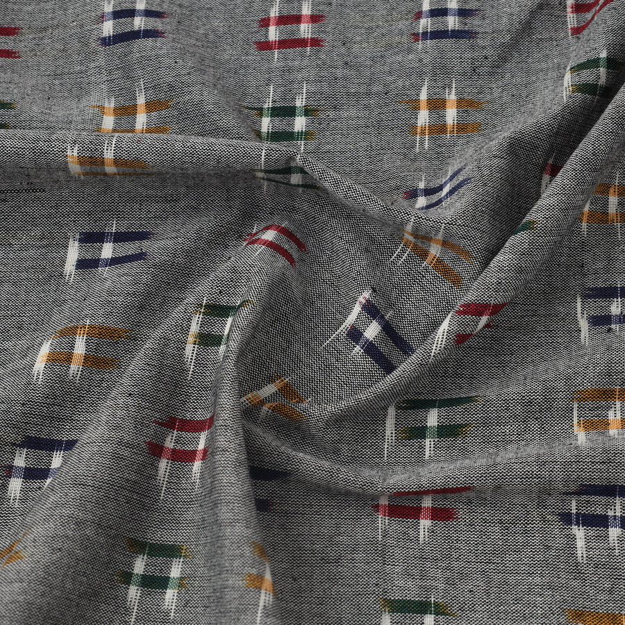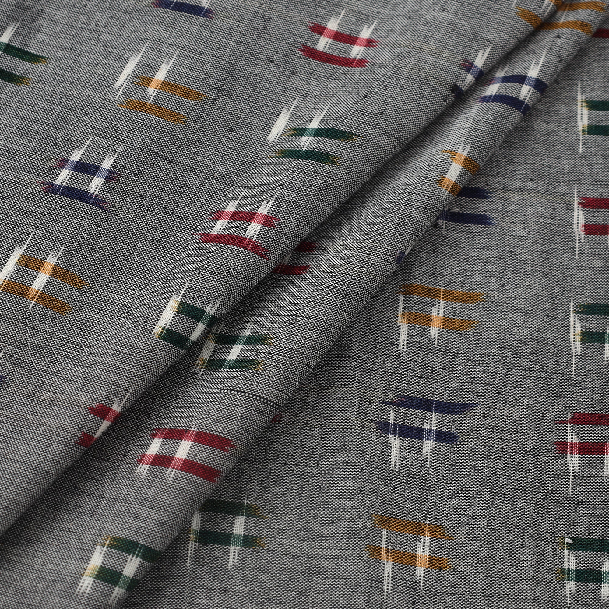 Fine quality grey handloom cotton pochampally double ikat fabric from Telangana. Ikat (Ikkat) is a dyeing technique used to pattern textiles through a resist dyeing process similar to tie-dye on either the warp or weft fibers prior to dyeing. Ikat has lovely patterns and are world famous for their extremely beautiful colors, texture and designs. Perfect for both traditional and modern projects. This piece carries tiny knots, thread pulls, or uneven lines — not flaws, but fingerprints. Every irregularity is a whisper from the hands that made it. It’s what happens when tradition weaves through time, not machines. If you’re looking for perfection, this isn’t it. But if you’re looking for soul — you’ve found it.