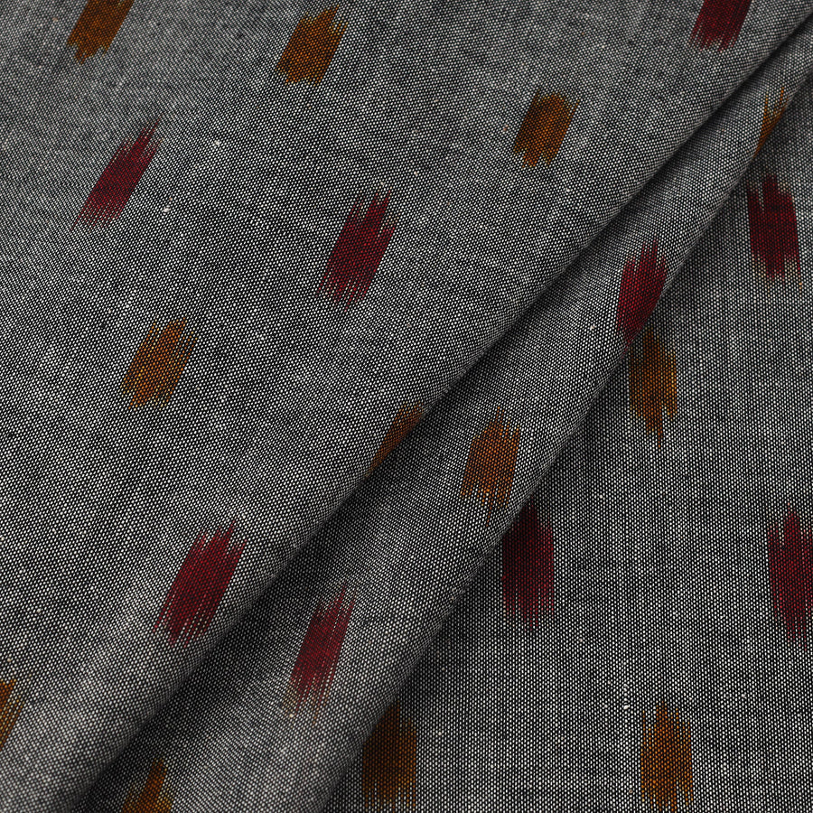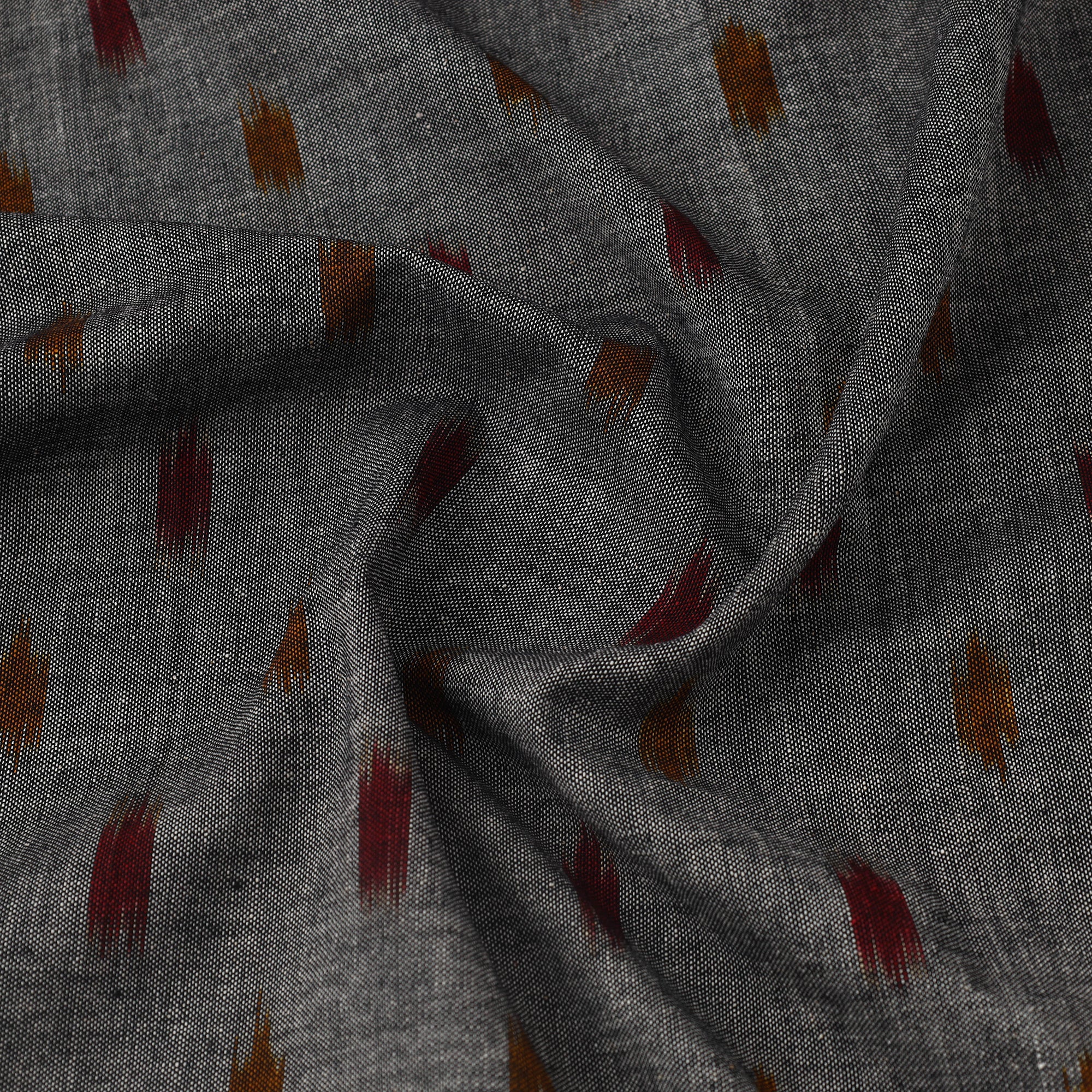 Fine quality grey handloom cotton pochampally double ikat fabric from Telangana. Ikat (Ikkat) is a dyeing technique used to pattern textiles through a resist dyeing process similar to tie-dye on either the warp or weft fibers prior to dyeing. Ikat has lovely patterns and are world famous for their extremely beautiful colors, texture and designs. Perfect for both traditional and modern projects. This piece carries tiny knots, thread pulls, or uneven lines — not flaws, but fingerprints. Every irregularity is a whisper from the hands that made it. It’s what happens when tradition weaves through time, not machines. If you’re looking for perfection, this isn’t it. But if you’re looking for soul — you’ve found it.