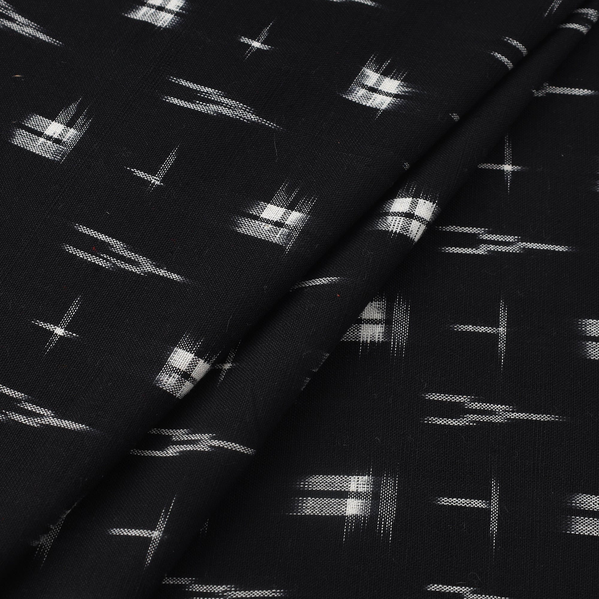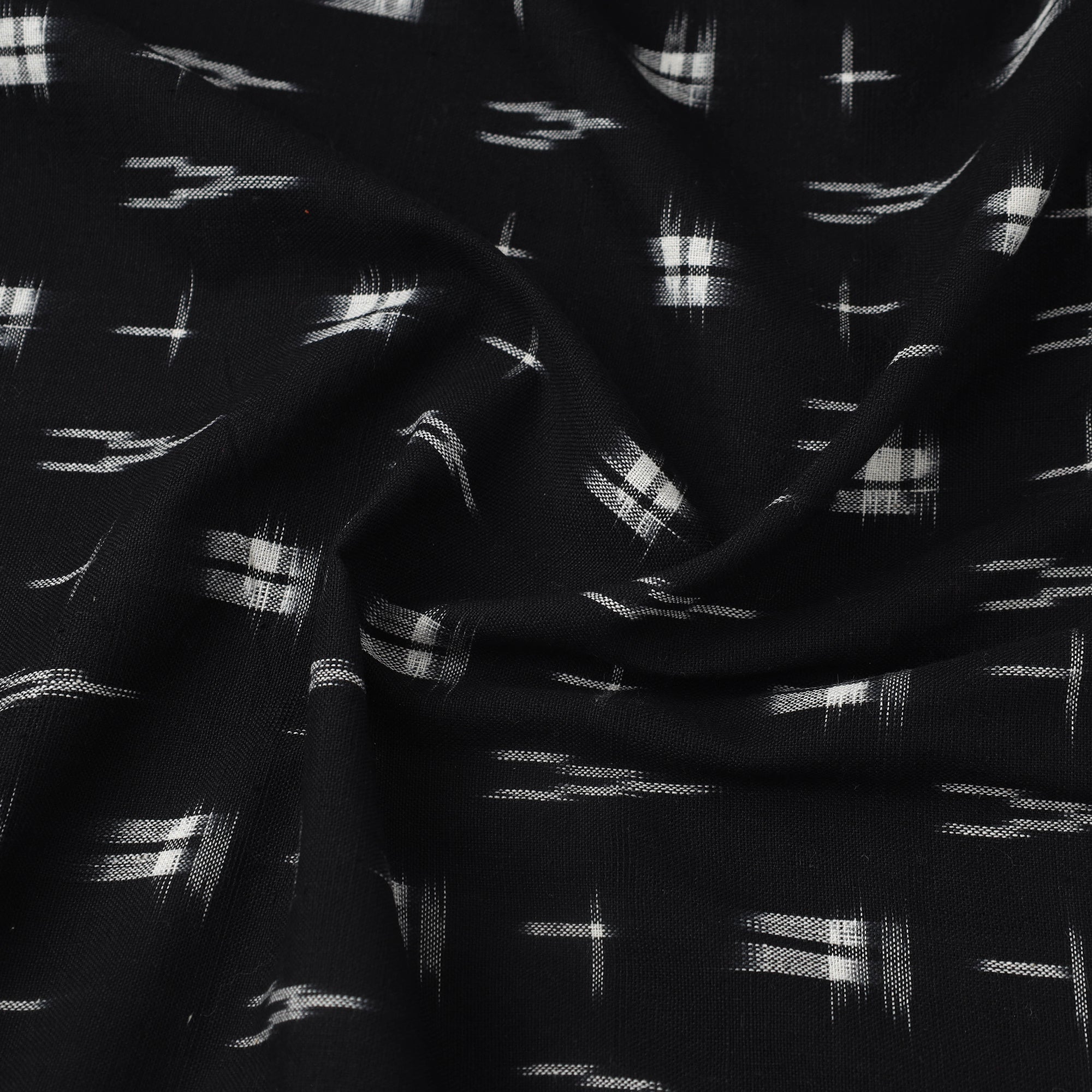 Fine quality black handloom cotton pochampally double ikat fabric from Telangana. Ikat (Ikkat) is a dyeing technique used to pattern textiles through a resist dyeing process similar to tie-dye on either the warp or weft fibers prior to dyeing. Ikat has lovely patterns and are world famous for their extremely beautiful colors, texture and designs. Perfect for both traditional and modern projects. This piece carries tiny knots, thread pulls, or uneven lines — not flaws, but fingerprints. Every irregularity is a whisper from the hands that made it. It’s what happens when tradition weaves through time, not machines. If you’re looking for perfection, this isn’t it. But if you’re looking for soul — you’ve found it.