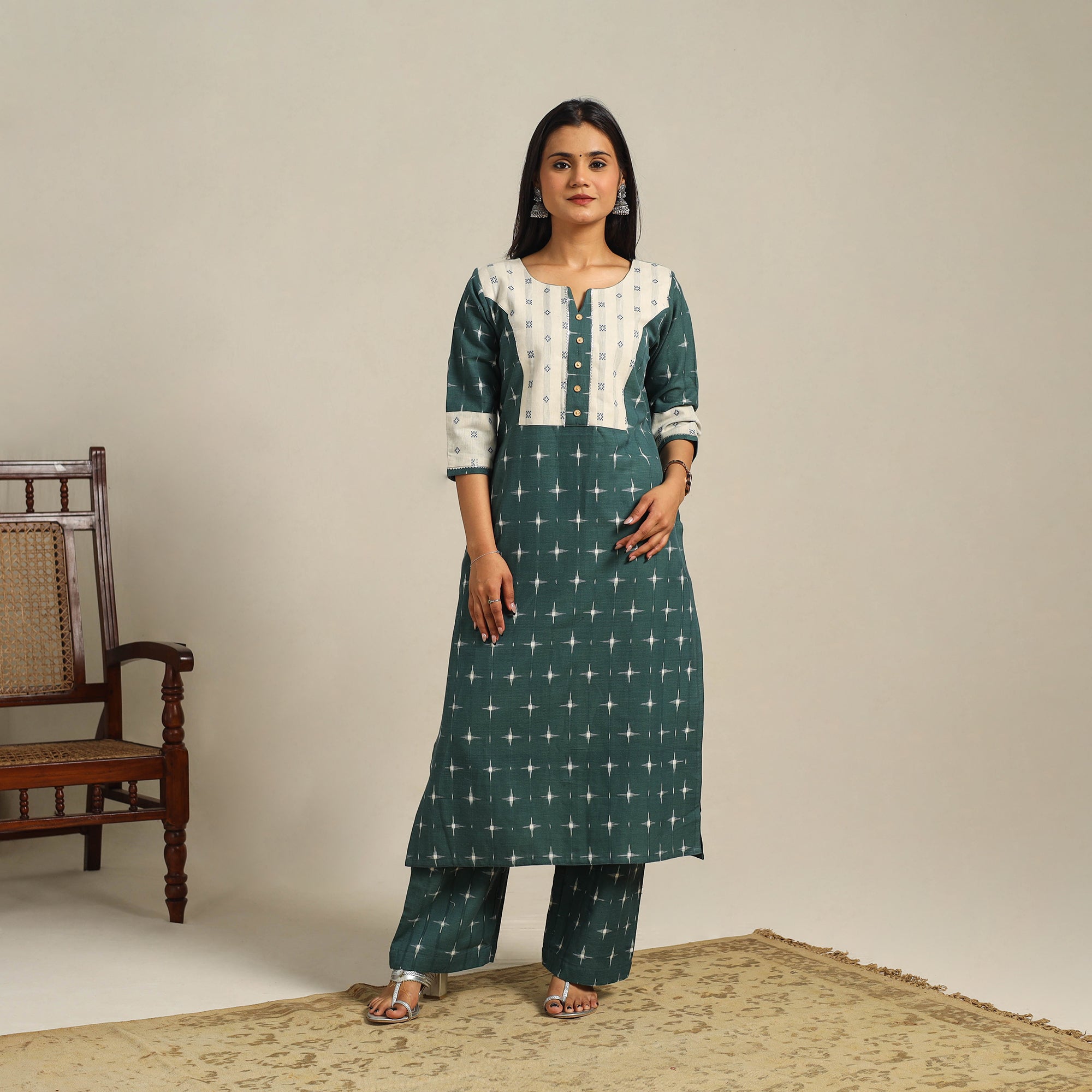 This green handloom cotton pochampally double Ikat kurta set showcases the traditional weaving artistry of Telangana. The straight-cut kurta includes a functional side pocket and is accented with a beautiful jacquard patch that adds texture and elegance. It is paired with a matching double Ikat palazzo featuring two side pockets and an elasticated waistband. In the intricate double Ikat technique, both warp and weft yarns are resist-dyed before weaving, resulting in timeless, interlocking patterns. Ideal for everyday wear, office looks, or relaxed gatherings.