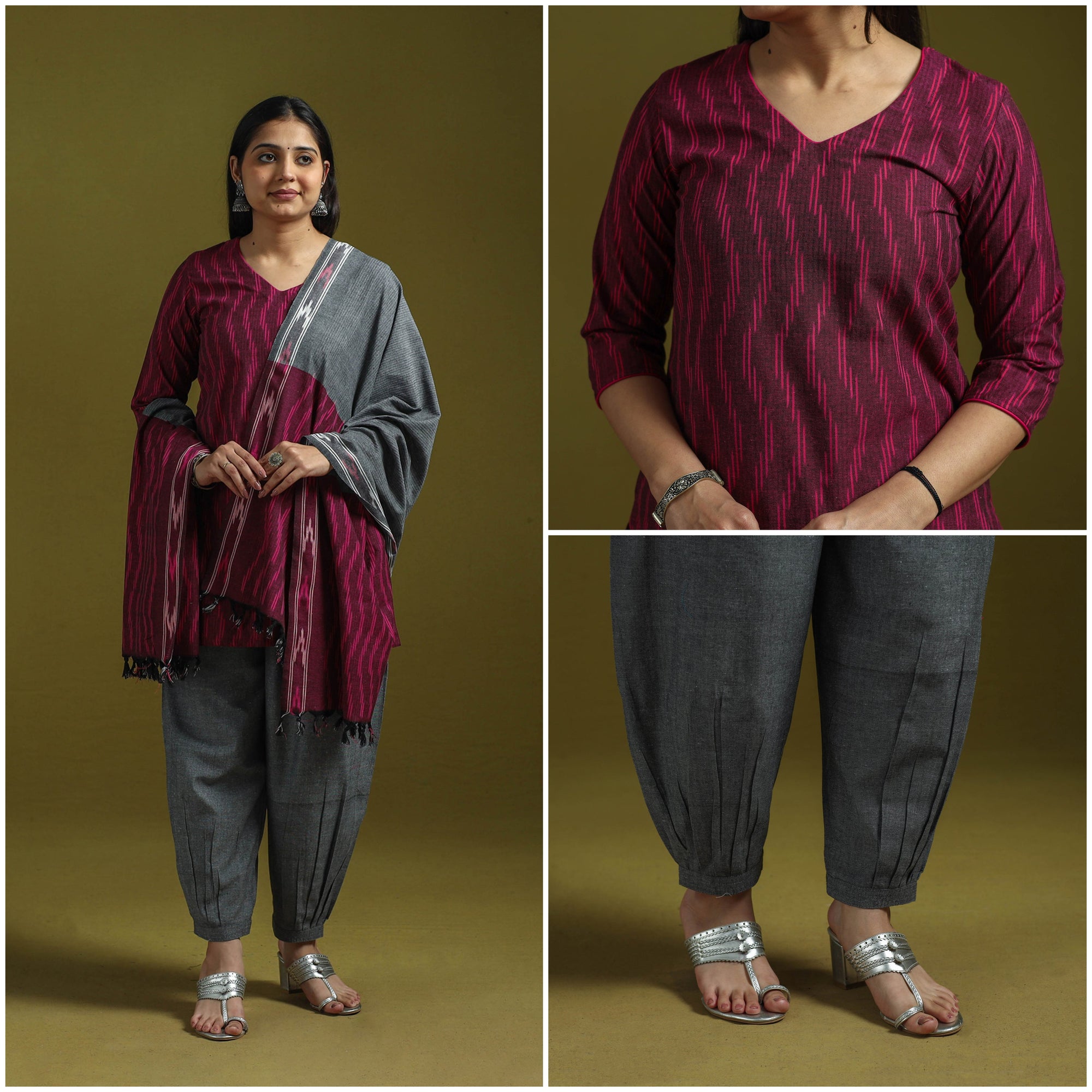 Handloom cotton pochampally ikat 3pc kurta set. It features comfortable short kurta, a plain afghani salwar with elasticated waistband and drawstring and matching dupatta. The Ikat technique in which yarns are resist dyed before weaving creates intricate patterns.