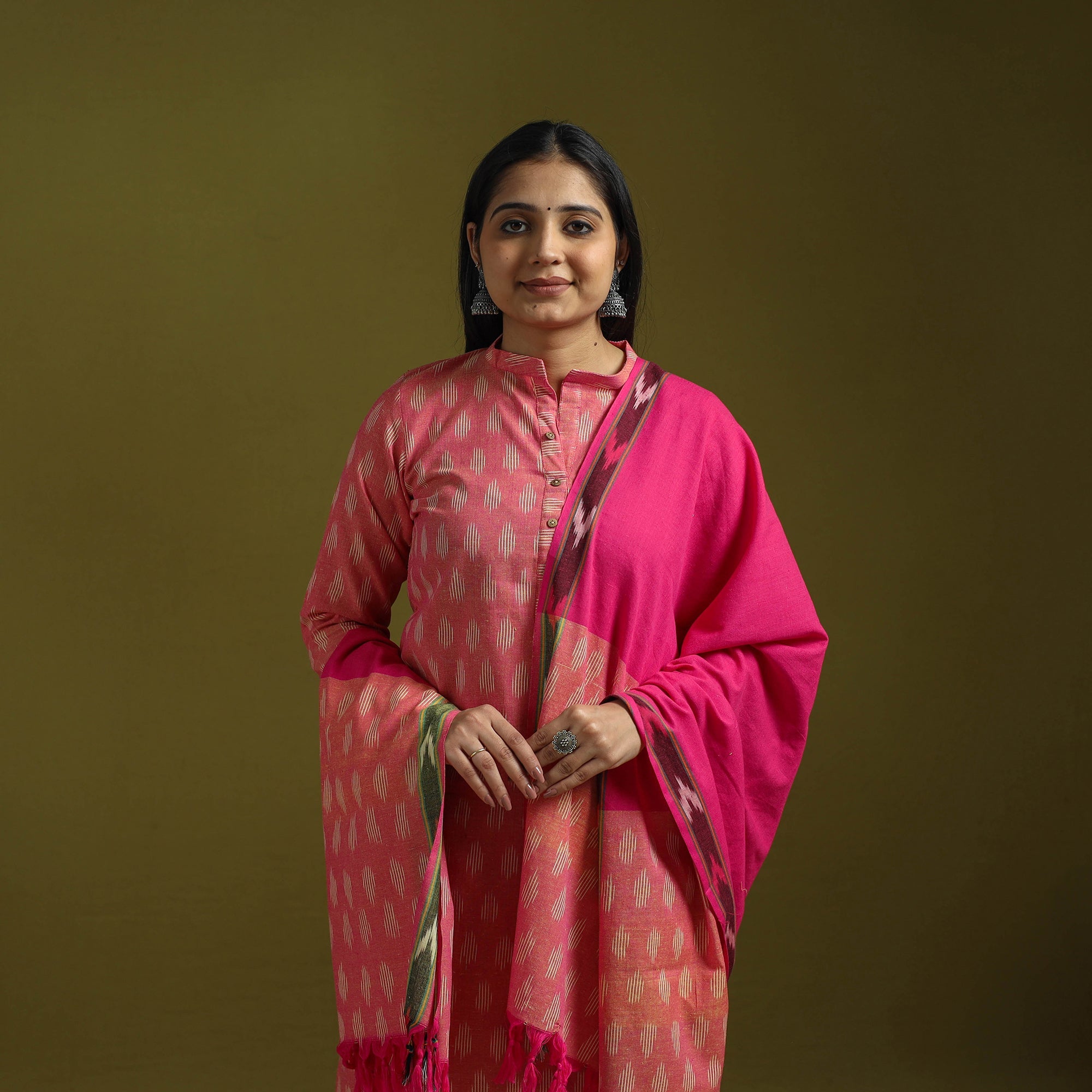 Handloom cotton pochampally ikat 3pc kurta set. It features comfortable straight kurta with side pocket a plain palazzo with two side pockets and elasticated waistband and matching dupatta. The Ikat technique in which yarns are resist dyed before weaving creates intricate patterns.