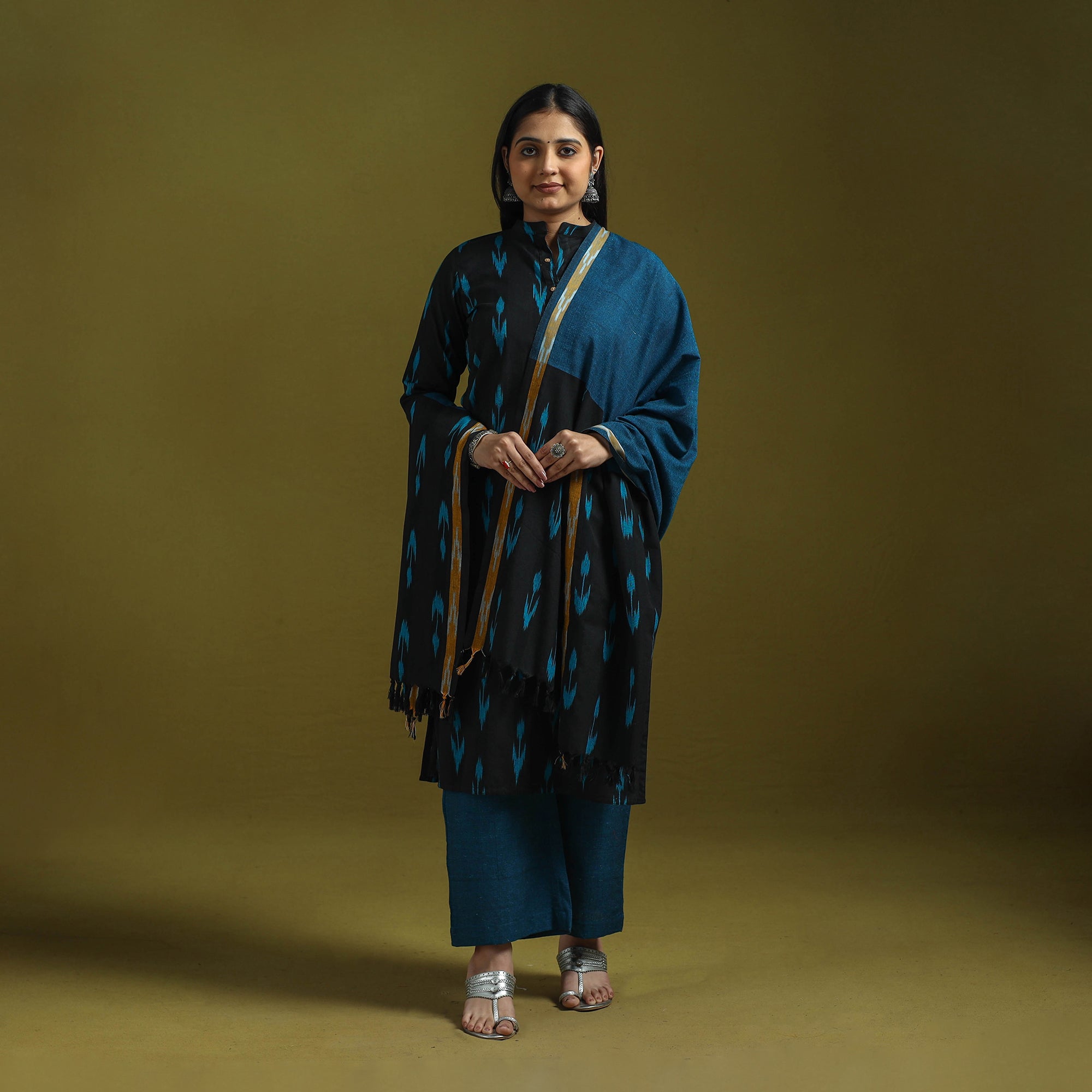 Handloom cotton pochampally ikat 3pc kurta set. It features comfortable straight kurta with side pocket a plain palazzo with two side pockets and elasticated waistband and matching dupatta. The Ikat technique in which yarns are resist dyed before weaving creates intricate patterns.