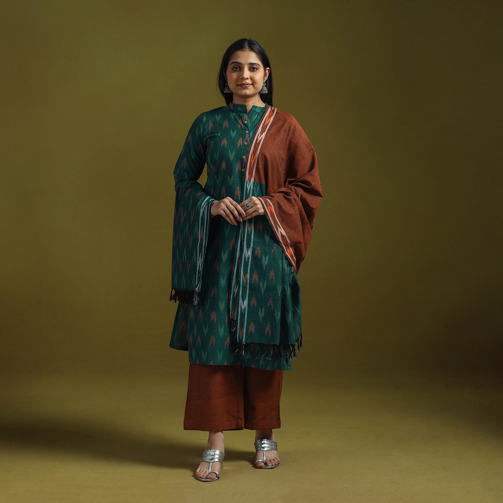 Handloom cotton pochampally ikat 3pc kurta set. It features comfortable straight kurta with side pocket a plain palazzo with two side pockets and elasticated waistband and matching dupatta. The Ikat technique in which yarns are resist dyed before weaving creates intricate patterns.