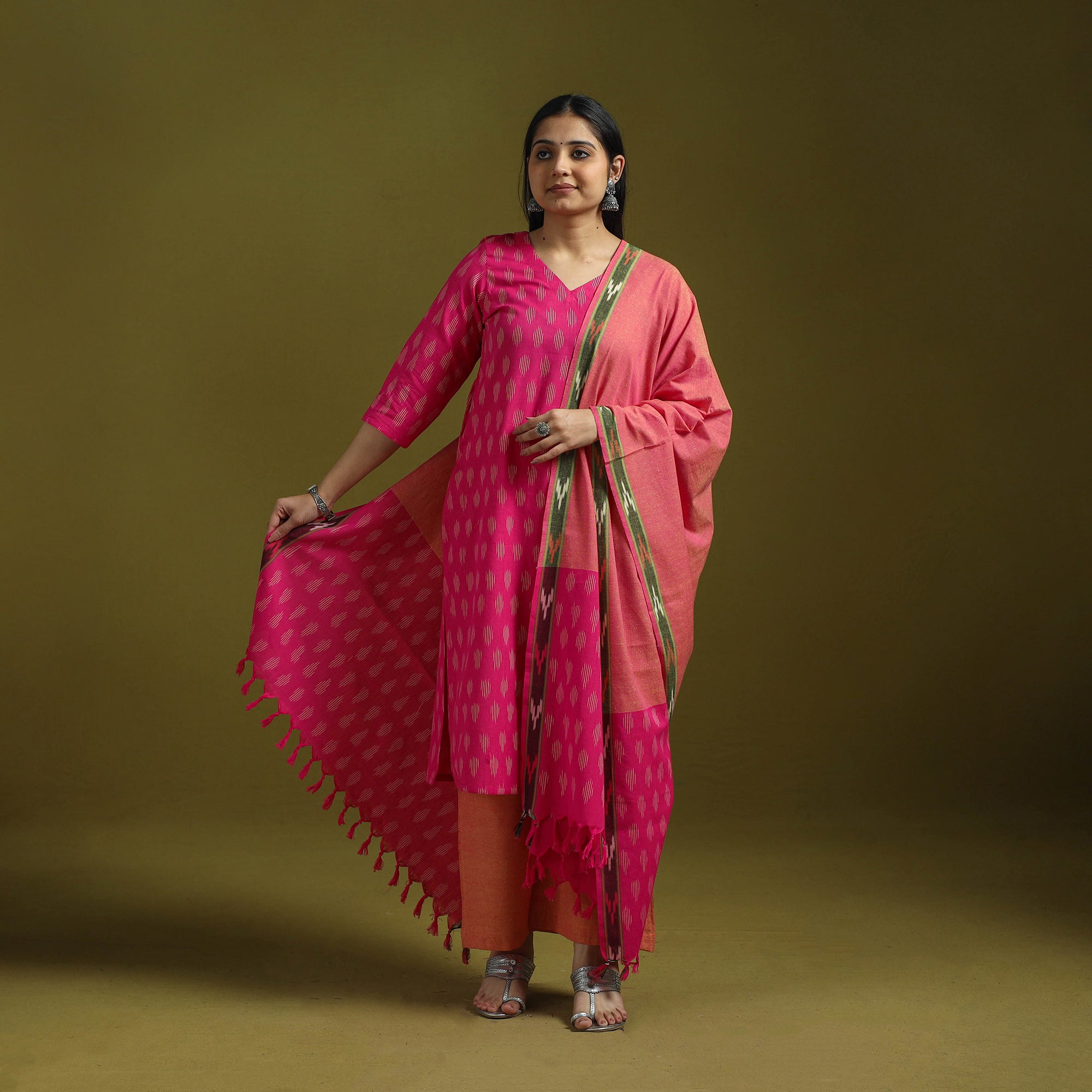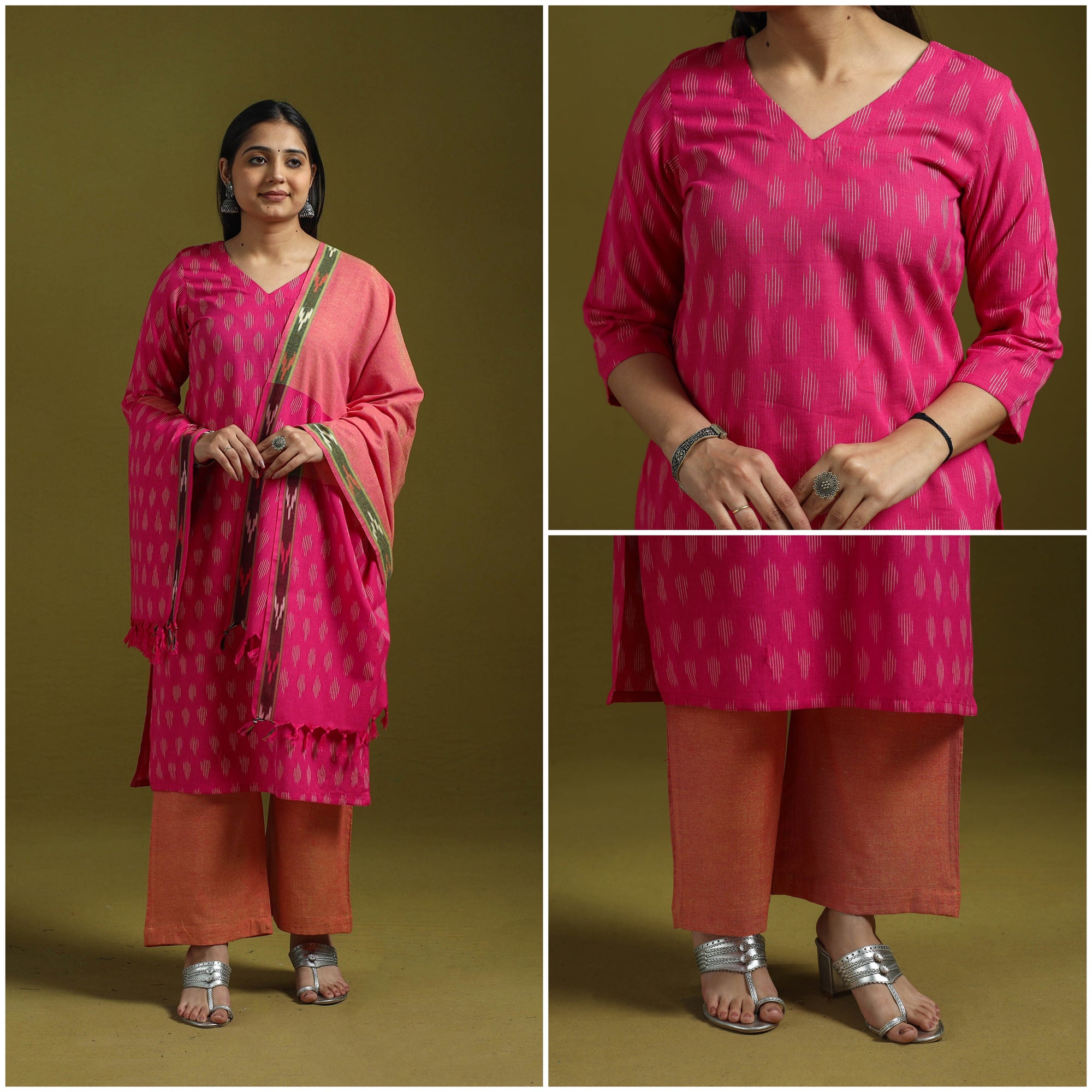 Handloom cotton pochampally ikat 3pc kurta set. It features comfortable straight kurta with side pocket a plain palazzo with two side pockets and elasticated waistband and matching dupatta. The Ikat technique in which yarns are resist dyed before weaving creates intricate patterns.