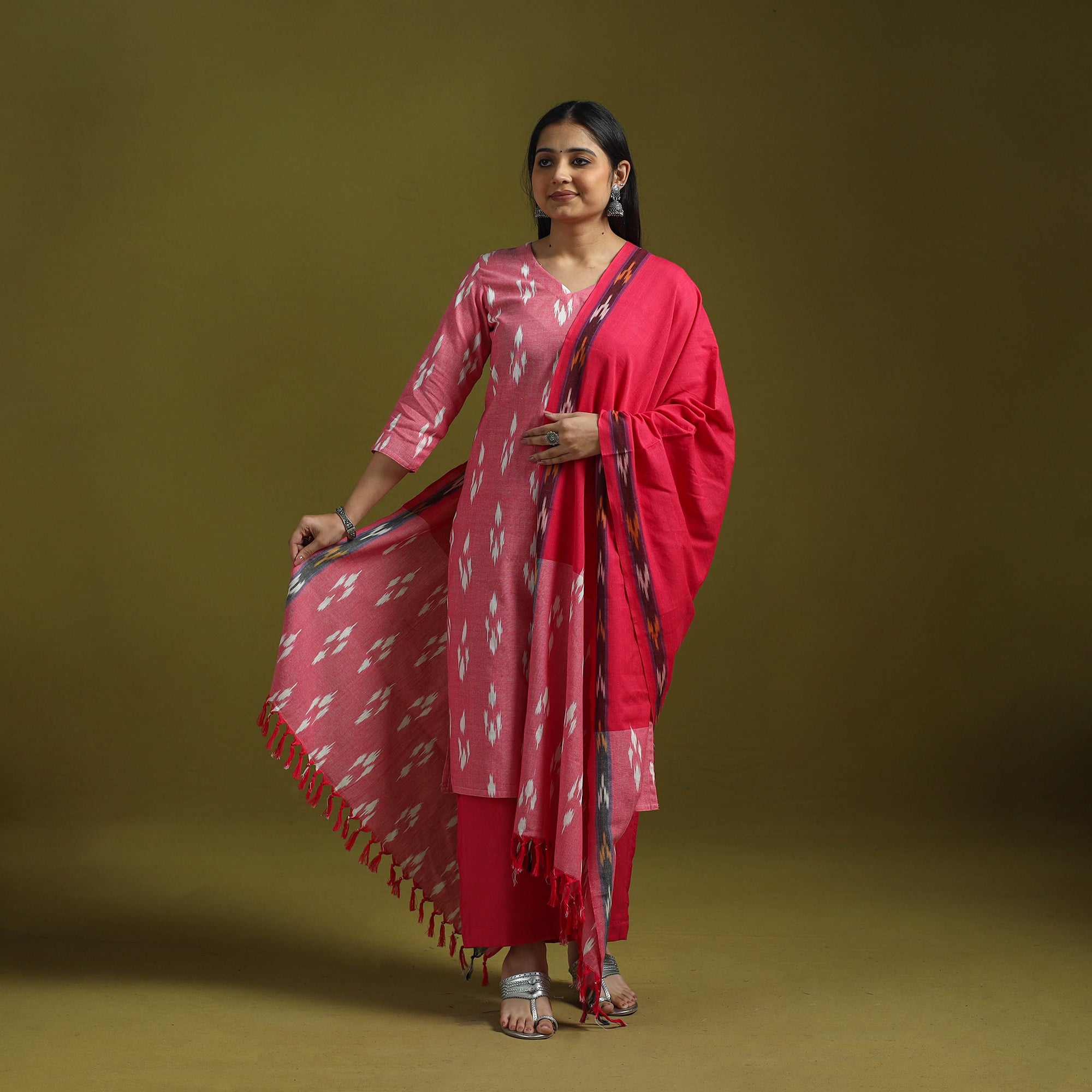 Handloom cotton pochampally ikat 3pc kurta set. It features comfortable straight kurta with side pocket a plain palazzo with two side pockets and elasticated waistband and matching dupatta. The Ikat technique in which yarns are resist dyed before weaving creates intricate patterns.