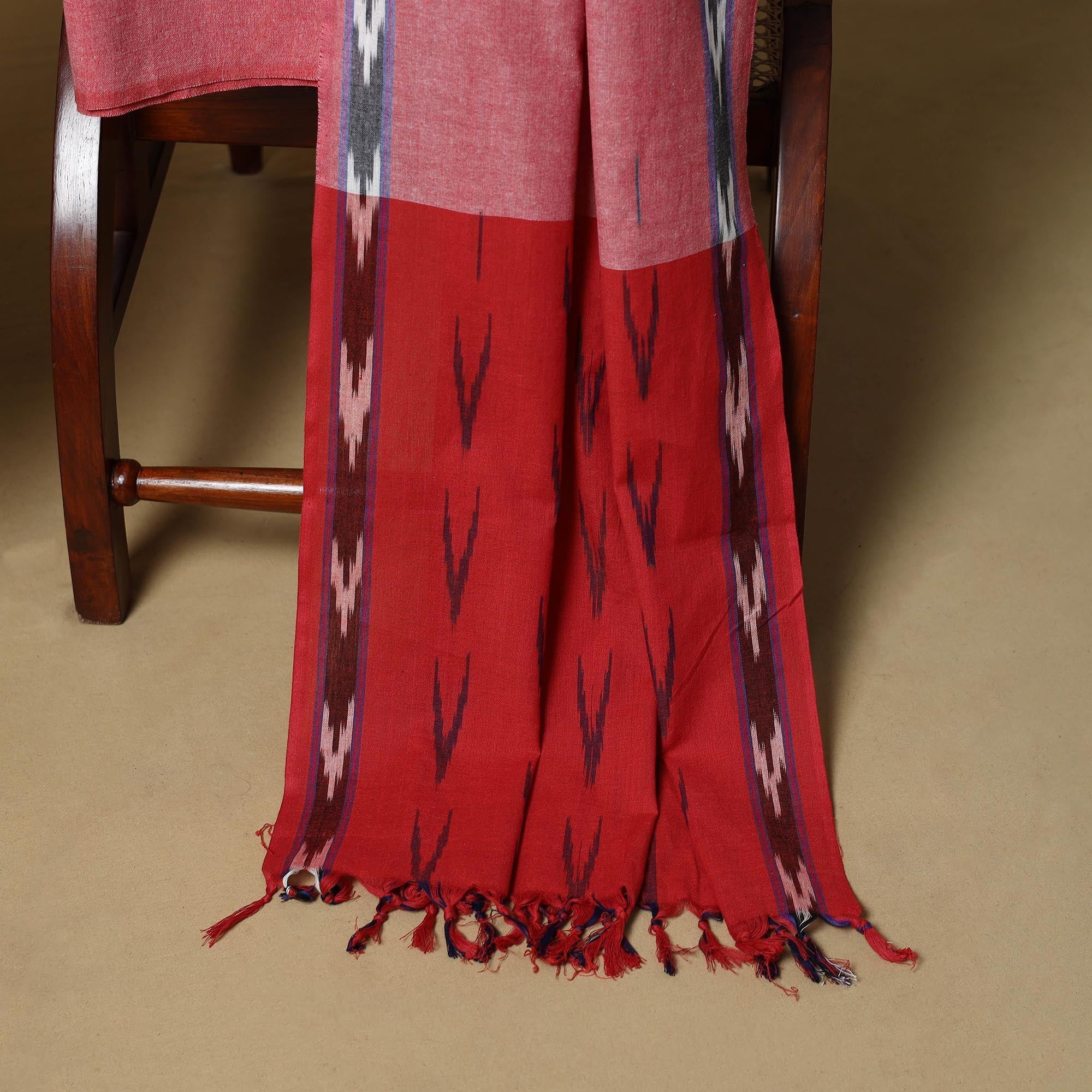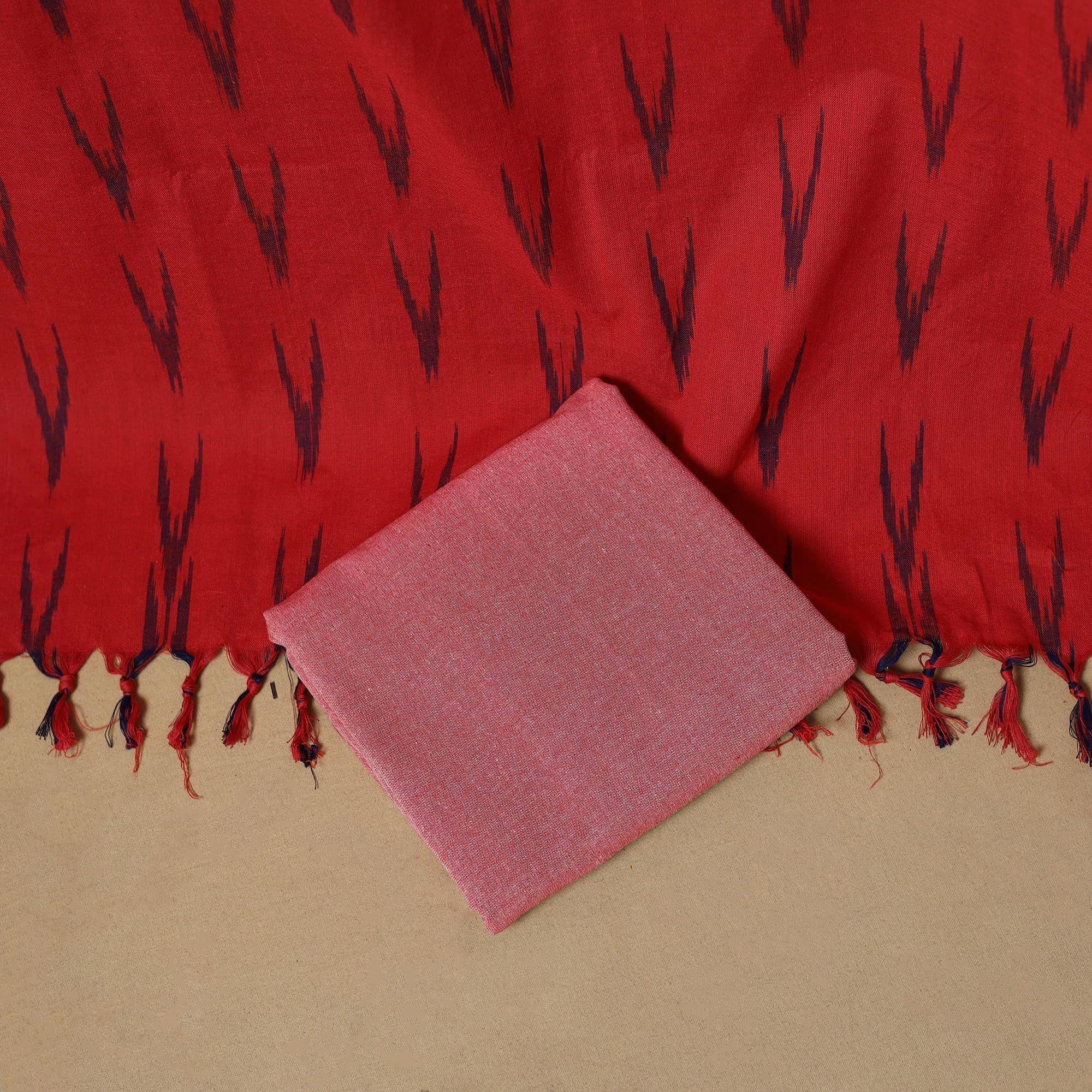 Red 3pc pochampally ikat handloom dress material set from Telangana is crafted in cotton and showcases the region’s signature Ikat technique, where the yarns are dyed before weaving. It includes a kurta, a dupatta, and a plain bottom. Ideal for weddings, parties and cultural gatherings, this set brings a refined, traditional touch to your wardrobe.