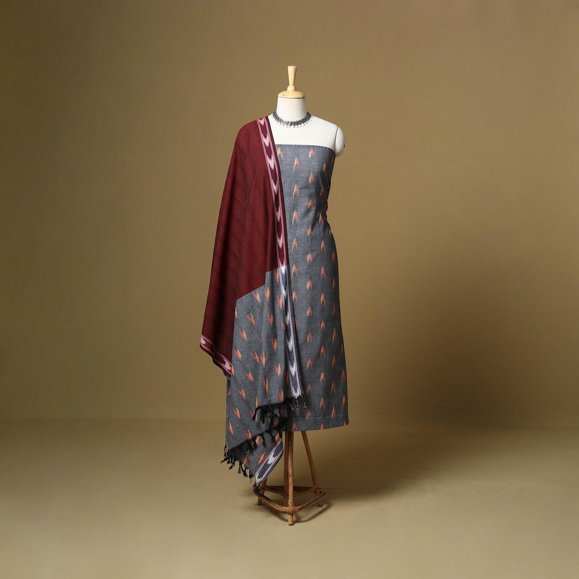 Grey 3pc pochampally ikat handloom dress material set from Telangana is crafted in cotton and showcases the region’s signature Ikat technique, where the yarns are dyed before weaving. It includes a kurta, a dupatta, and a plain bottom. Ideal for weddings, parties and cultural gatherings, this set brings a refined, traditional touch to your wardrobe.