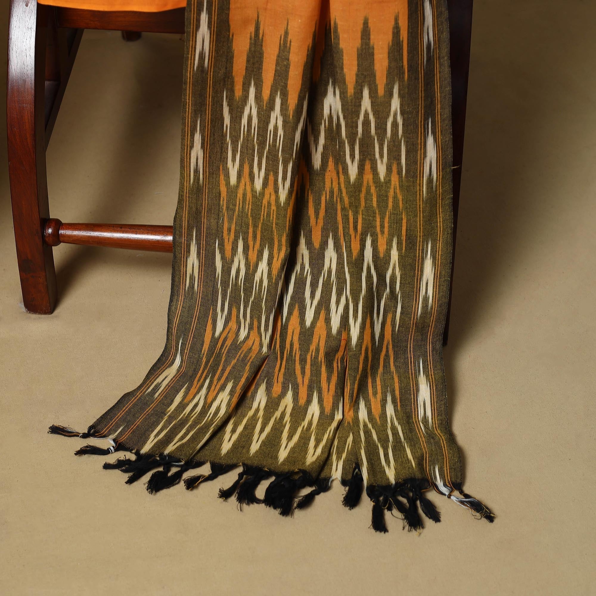 Green 3pc pochampally ikat handloom dress material set from Telangana is crafted in cotton and showcases the region’s signature Ikat technique, where the yarns are dyed before weaving. It includes a kurta, a dupatta, and a plain bottom. Ideal for weddings, parties and cultural gatherings, this set brings a refined, traditional touch to your wardrobe.