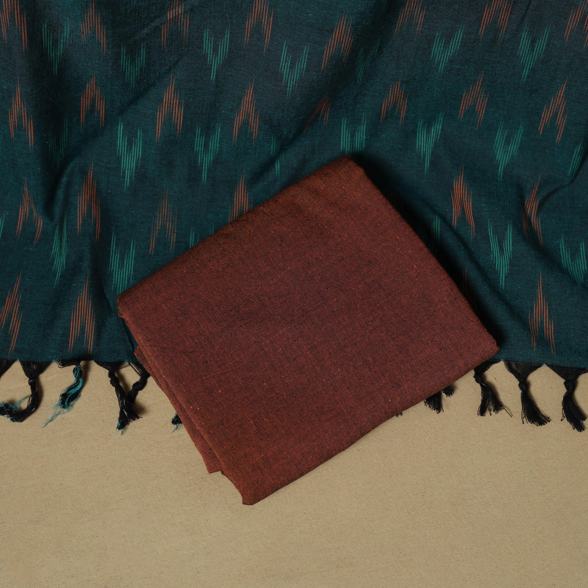 Green 3pc pochampally ikat handloom dress material set from Telangana is crafted in cotton and showcases the region’s signature Ikat technique, where the yarns are dyed before weaving. It includes a kurta, a dupatta, and a plain bottom. Ideal for weddings, parties and cultural gatherings, this set brings a refined, traditional touch to your wardrobe.