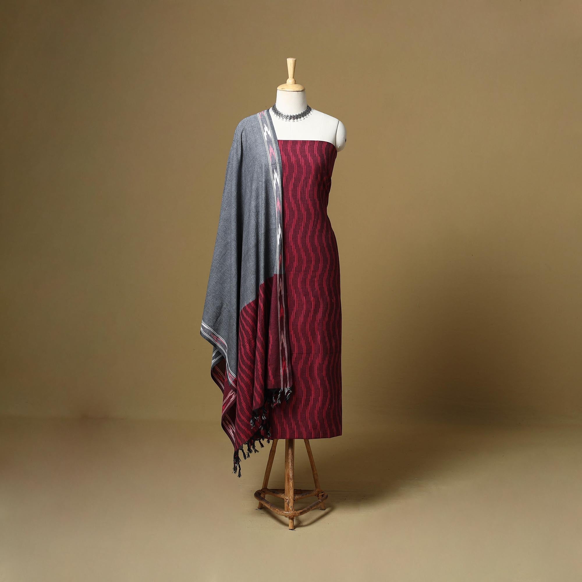 Red 3pc pochampally ikat handloom dress material set from Telangana is crafted in cotton and showcases the region’s signature Ikat technique, where the yarns are dyed before weaving. It includes a kurta, a dupatta, and a plain bottom. Ideal for weddings, parties and cultural gatherings, this set brings a refined, traditional touch to your wardrobe.