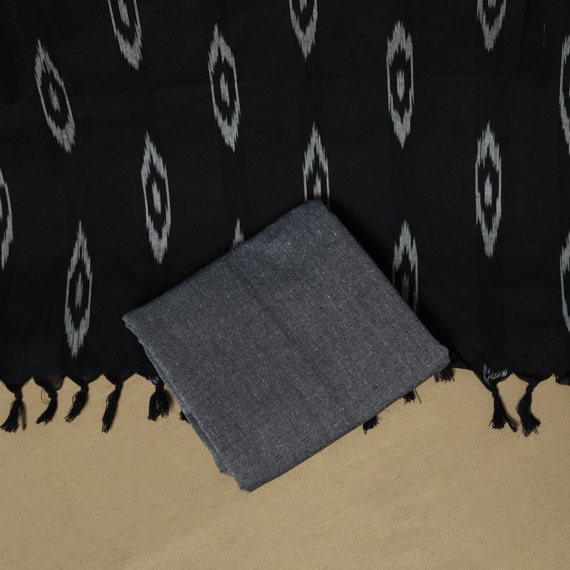 Black 3pc pochampally ikat handloom dress material set from Telangana is crafted in cotton and showcases the region’s signature Ikat technique, where the yarns are dyed before weaving. It includes a kurta, a dupatta, and a plain bottom. Ideal for weddings, parties and cultural gatherings, this set brings a refined, traditional touch to your wardrobe.
