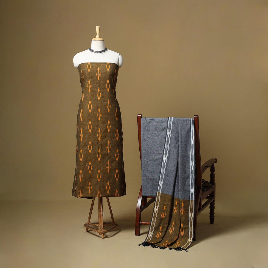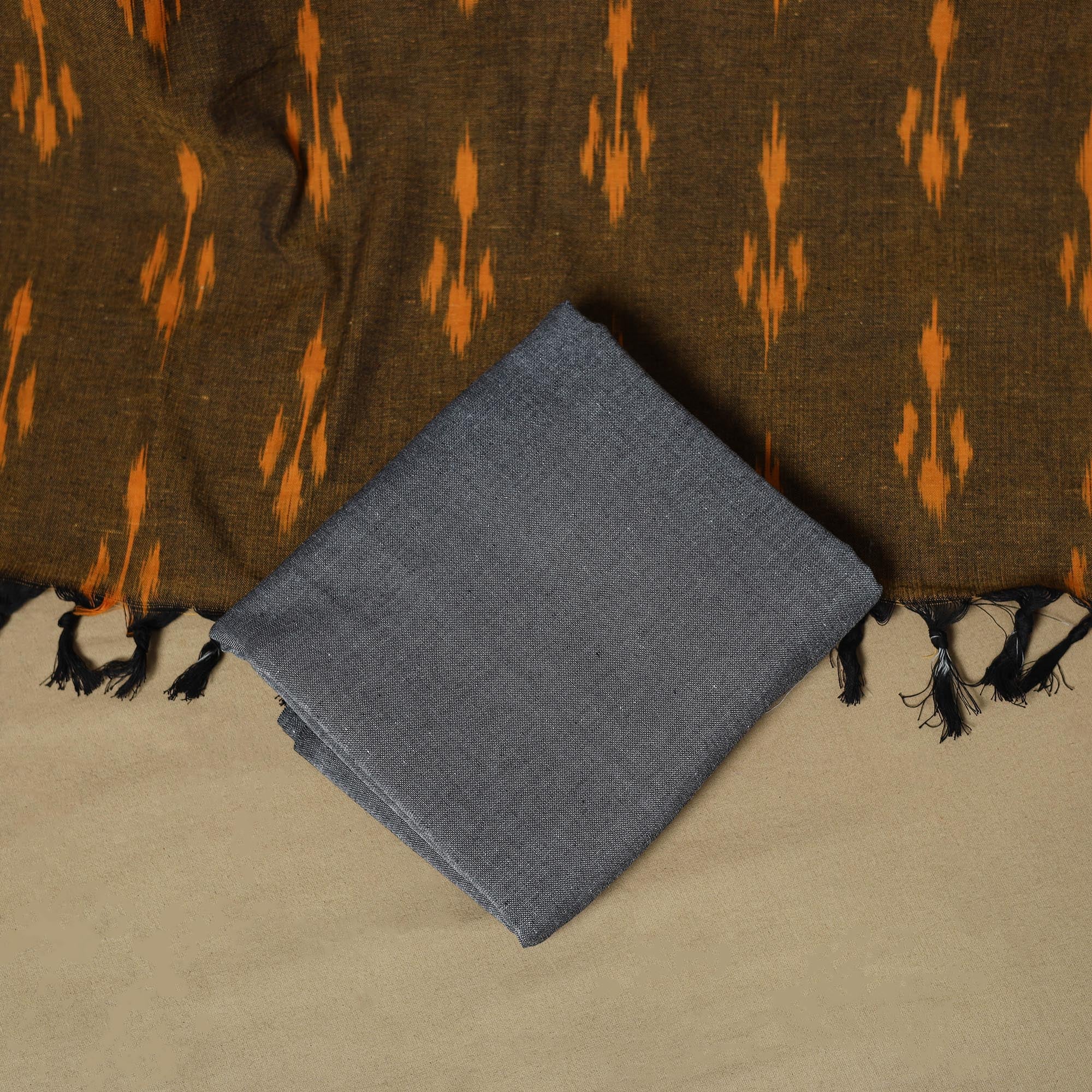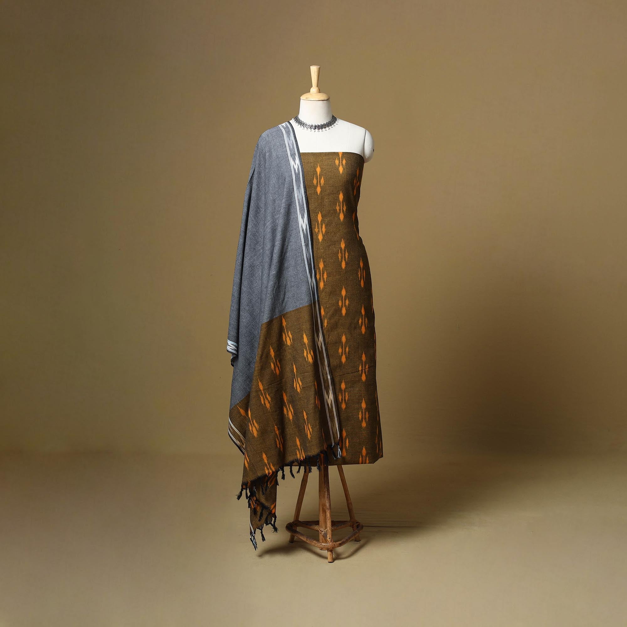 Brown 3pc pochampally ikat handloom dress material set from Telangana is crafted in cotton and showcases the region’s signature Ikat technique, where the yarns are dyed before weaving. It includes a kurta, a dupatta, and a plain bottom. Ideal for weddings, parties and cultural gatherings, this set brings a refined, traditional touch to your wardrobe.