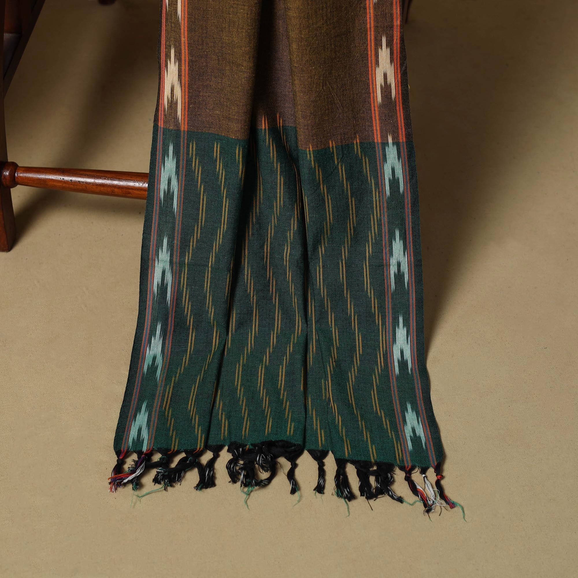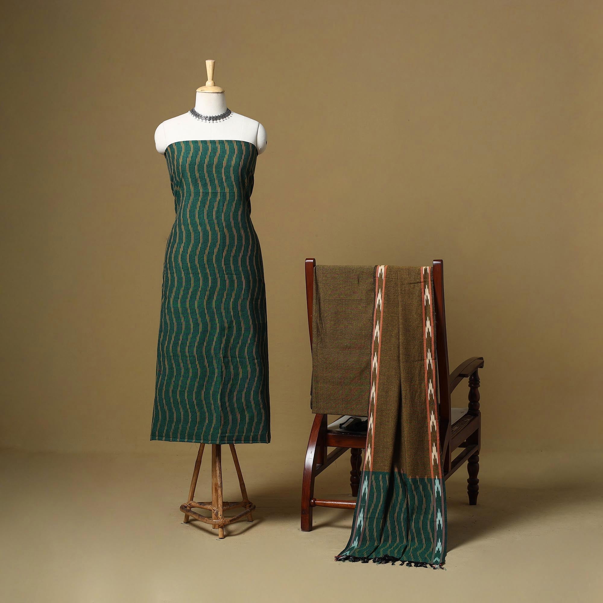 Green 3pc pochampally ikat handloom dress material set from Telangana is crafted in cotton and showcases the region’s signature Ikat technique, where the yarns are dyed before weaving. It includes a kurta, a dupatta, and a plain bottom. Ideal for weddings, parties and cultural gatherings, this set brings a refined, traditional touch to your wardrobe.