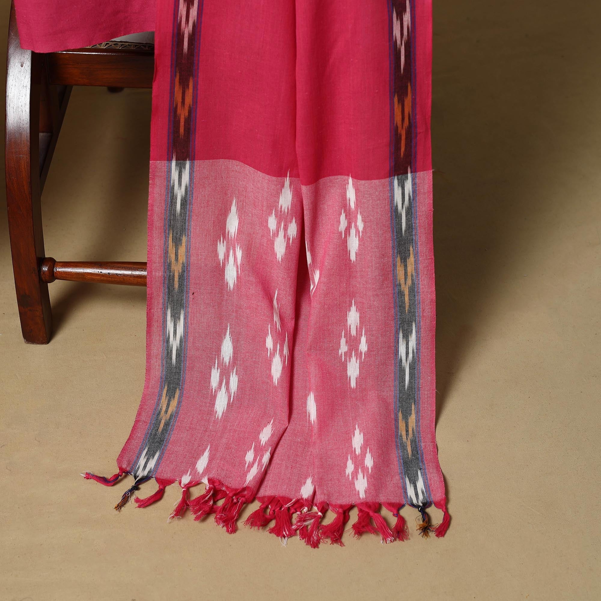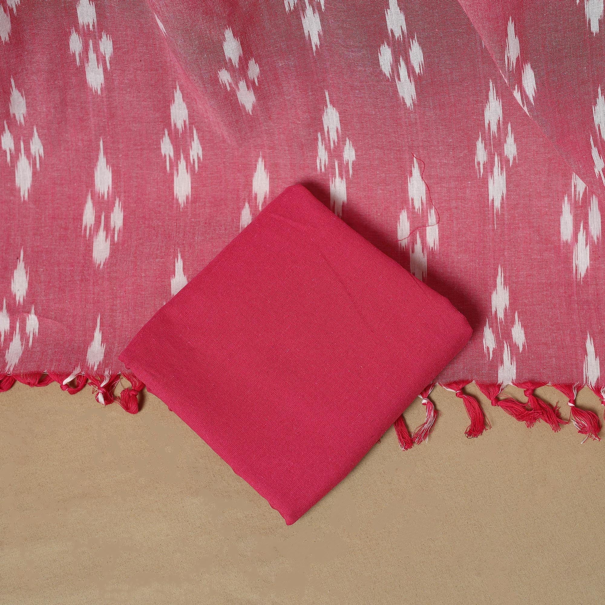 Pink 3pc pochampally ikat handloom dress material set from Telangana is crafted in cotton and showcases the region’s signature Ikat technique, where the yarns are dyed before weaving. It includes a kurta, a dupatta, and a plain bottom. Ideal for weddings, parties and cultural gatherings, this set brings a refined, traditional touch to your wardrobe.
