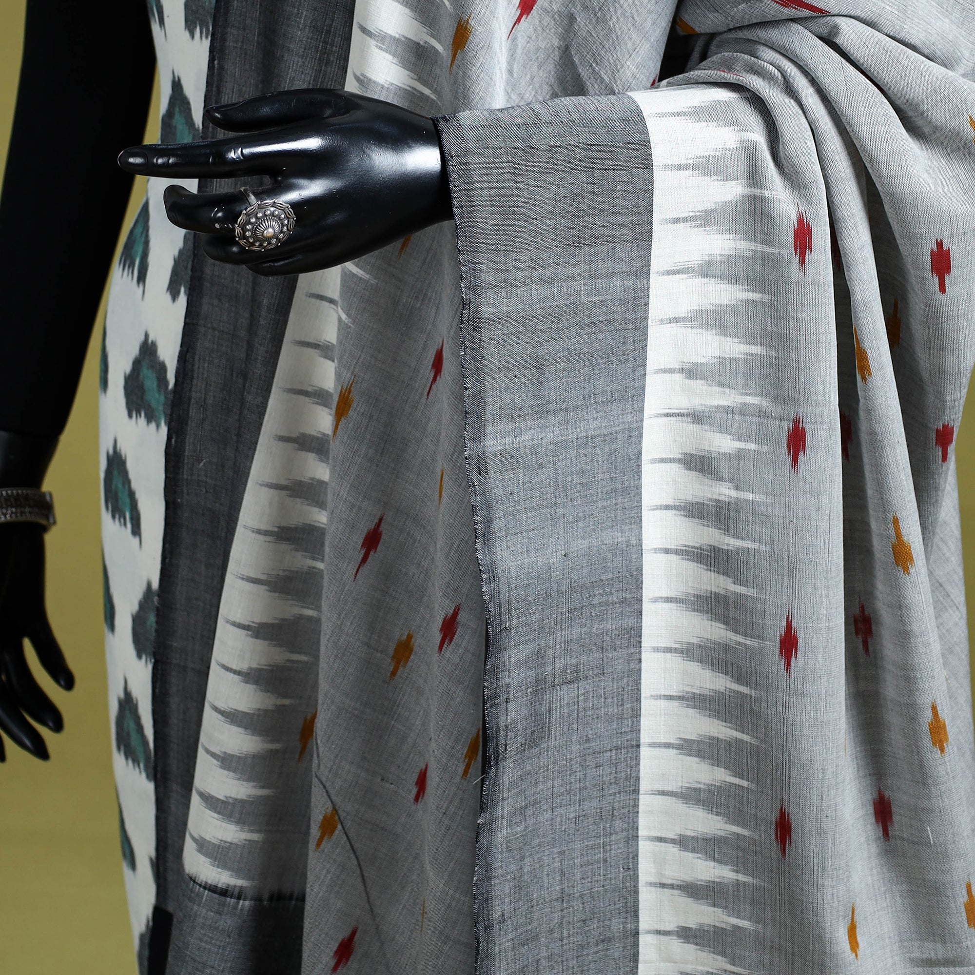 Grey handloom pochampally Ikat cotton dupatta with tassels, woven by skilled artisans in Telangana. Ikat (also spelled Ikkat) is a traditional dyeing technique that involves resist dyeing on either the warp or weft yarns before weaving. Celebrated for its intricate motifs and textured appeal, this dupatta is perfect for festive occasions, casual outings, or adding a touch of timeless elegance to everyday wear.