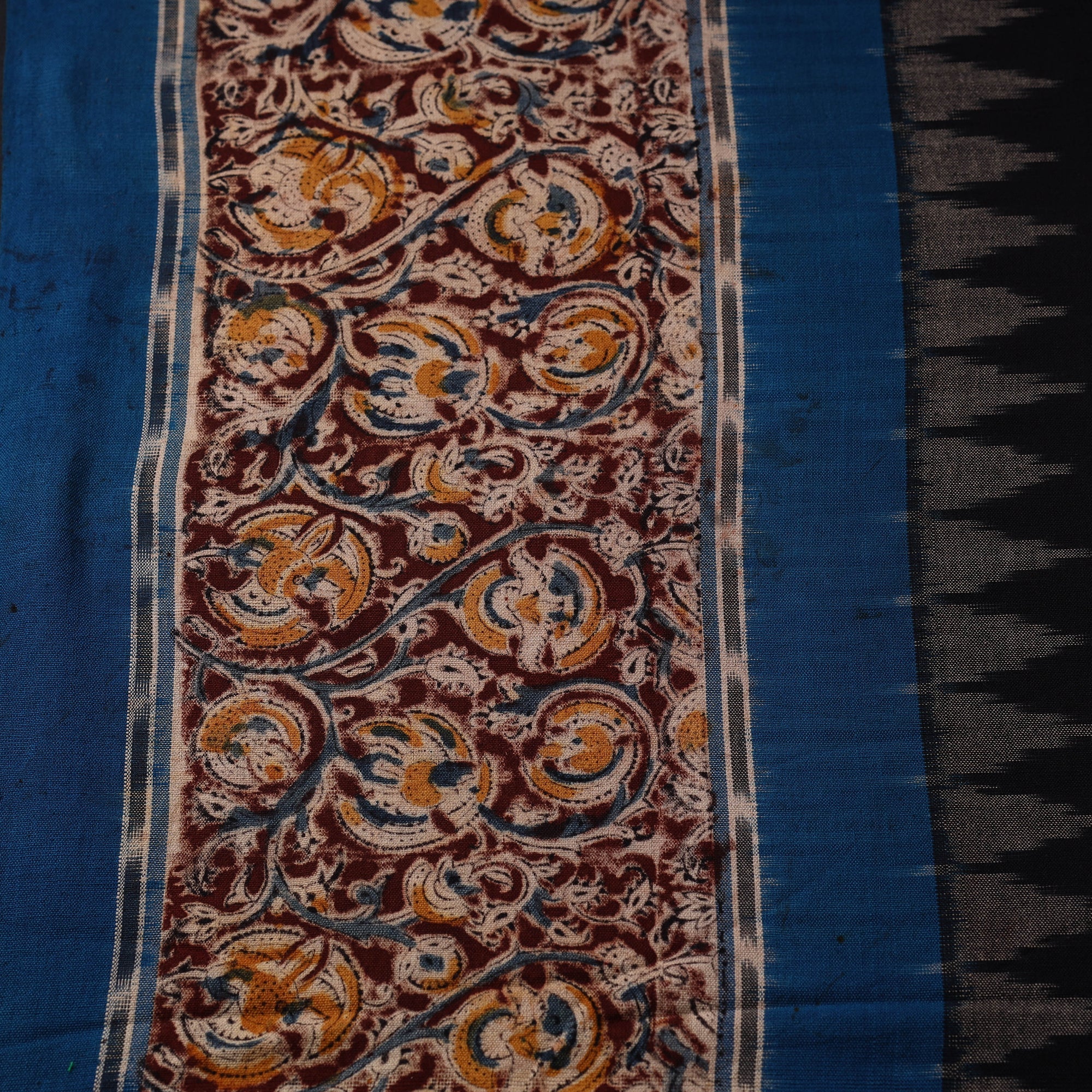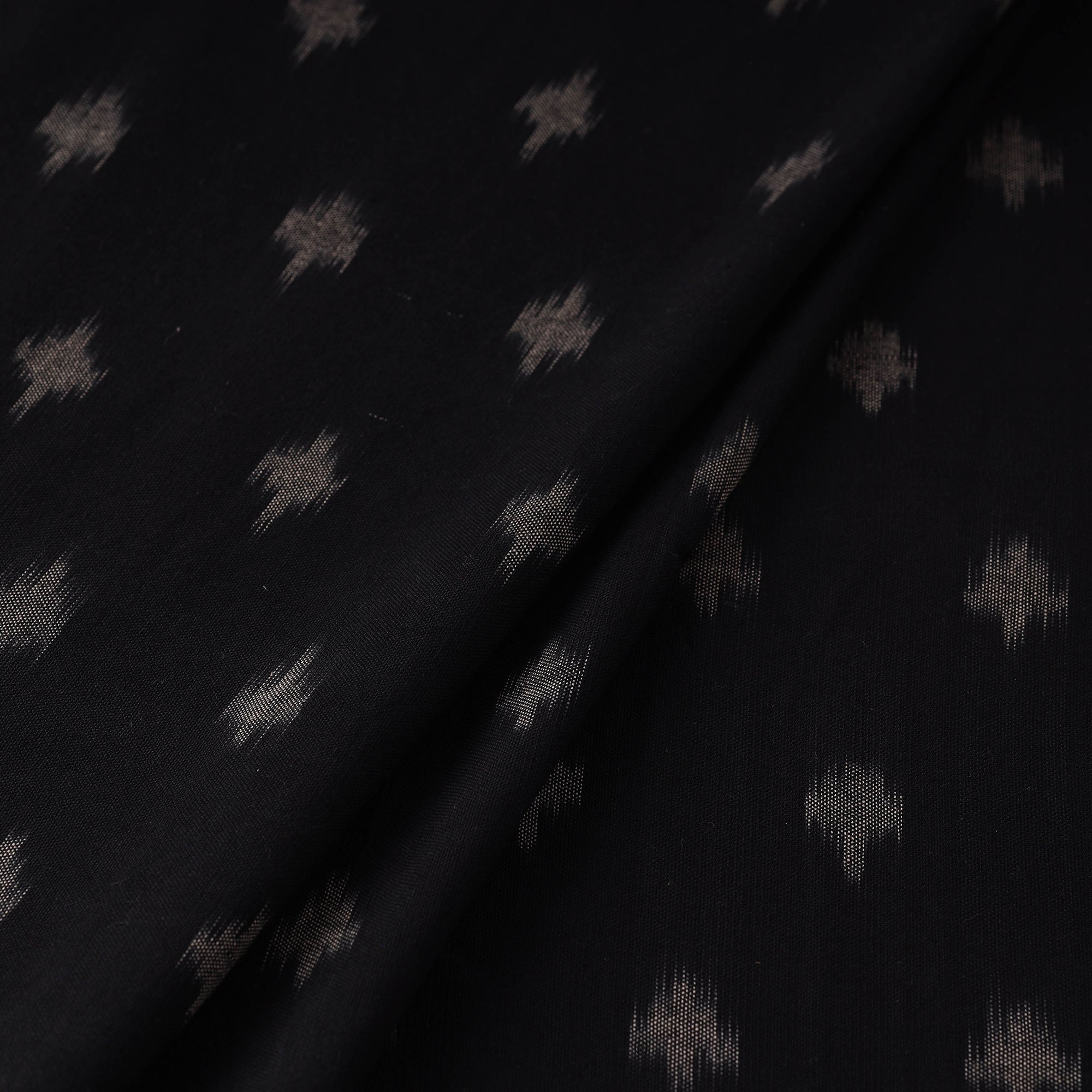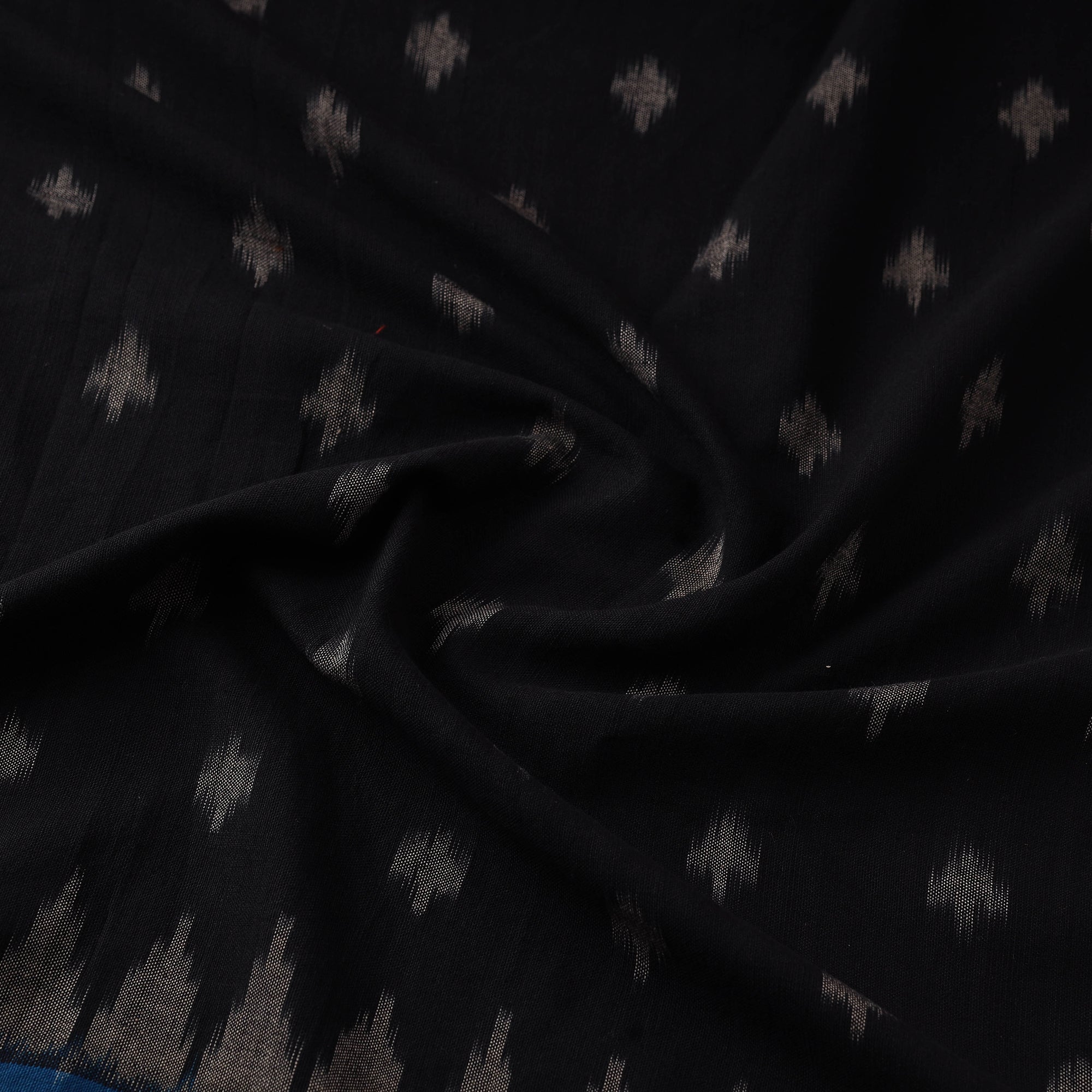 This black handloom pure cotton pochampally ikat fabric from Telangana features geometric patterns made using the traditional resist-dyeing method, where both warp and weft threads are dyed before weaving. It comes with a beautiful kalamkari block print border. A perfect choice for ethnic wear, stylish home decor, or creative DIY projects.