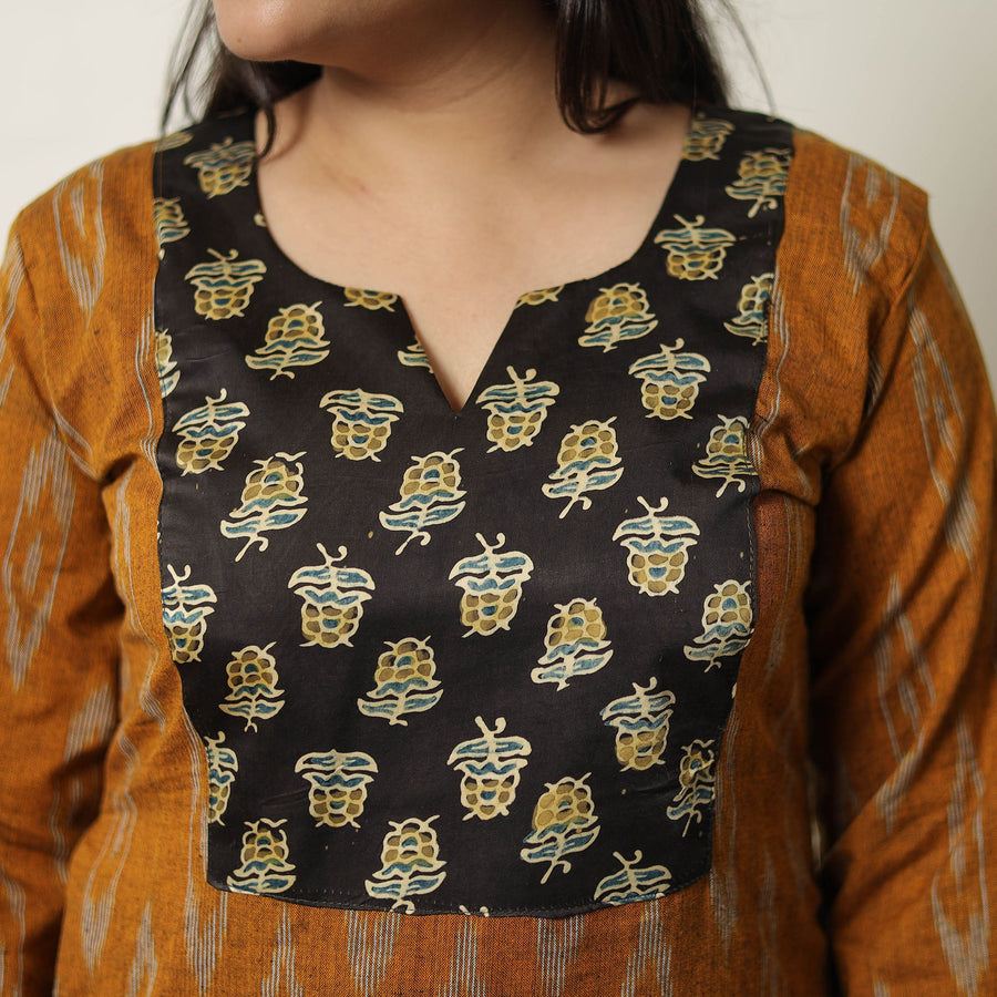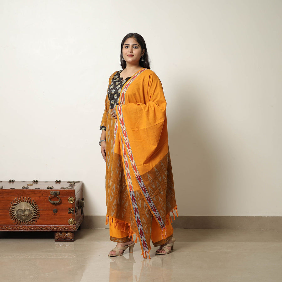 Orange handloom cotton pochampally ikat kurta set. The set features a stylish kurta with a side pocket, a comfortable palazzo with an elastic waist and two side pockets, and a matching dupatta. This traditional ikat weaving technique from Telangana reflects India's rich textile heritage. This kurta set is perfect for an elegant yet functional look.