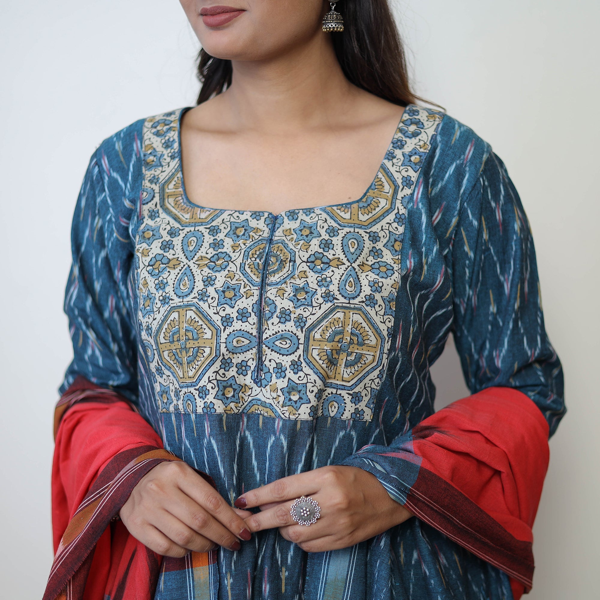 Embrace the timeless elegance of the blue handloom cotton pochampally ikat kurta set. Featuring a stylish kurta with patchwork and a side pocket, this set is the perfect combination of tradition and modern comfort. The matching palazzo comes with an elasticized waist and pockets, adding functionality to the design. Paired with a dupatta, this handloom suit set showcases India’s rich textile heritage.
