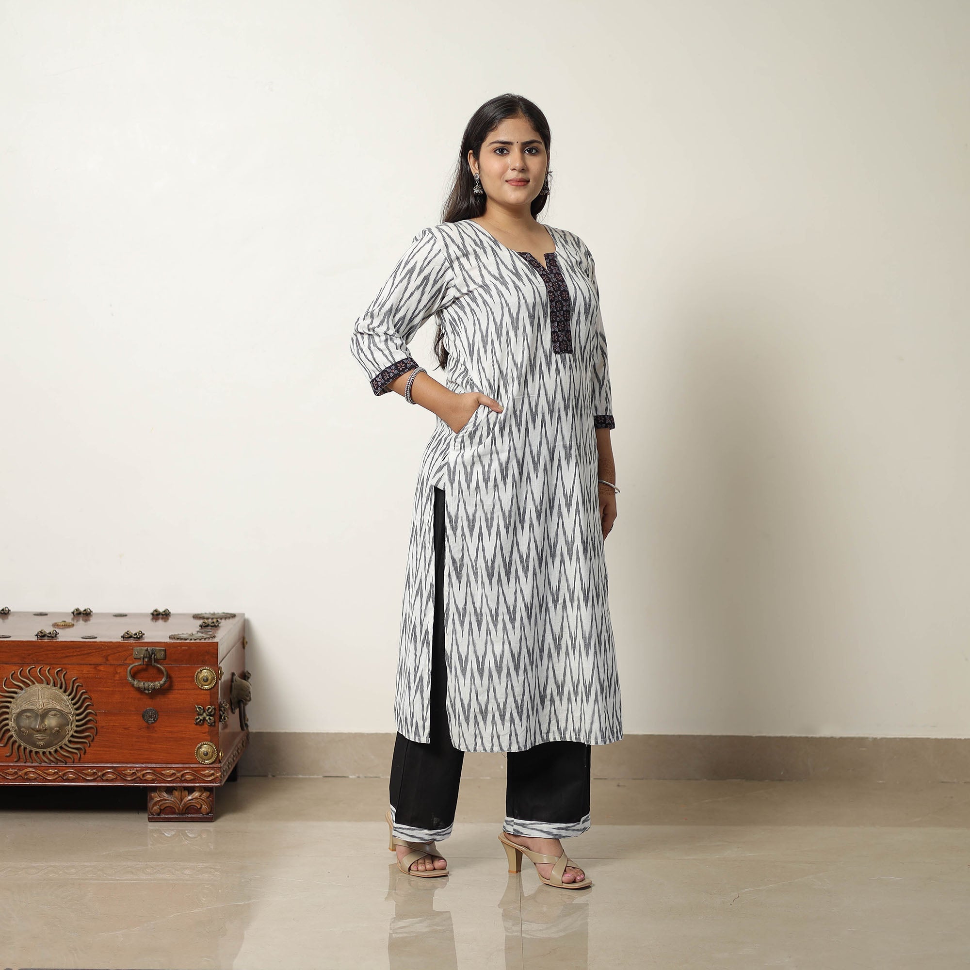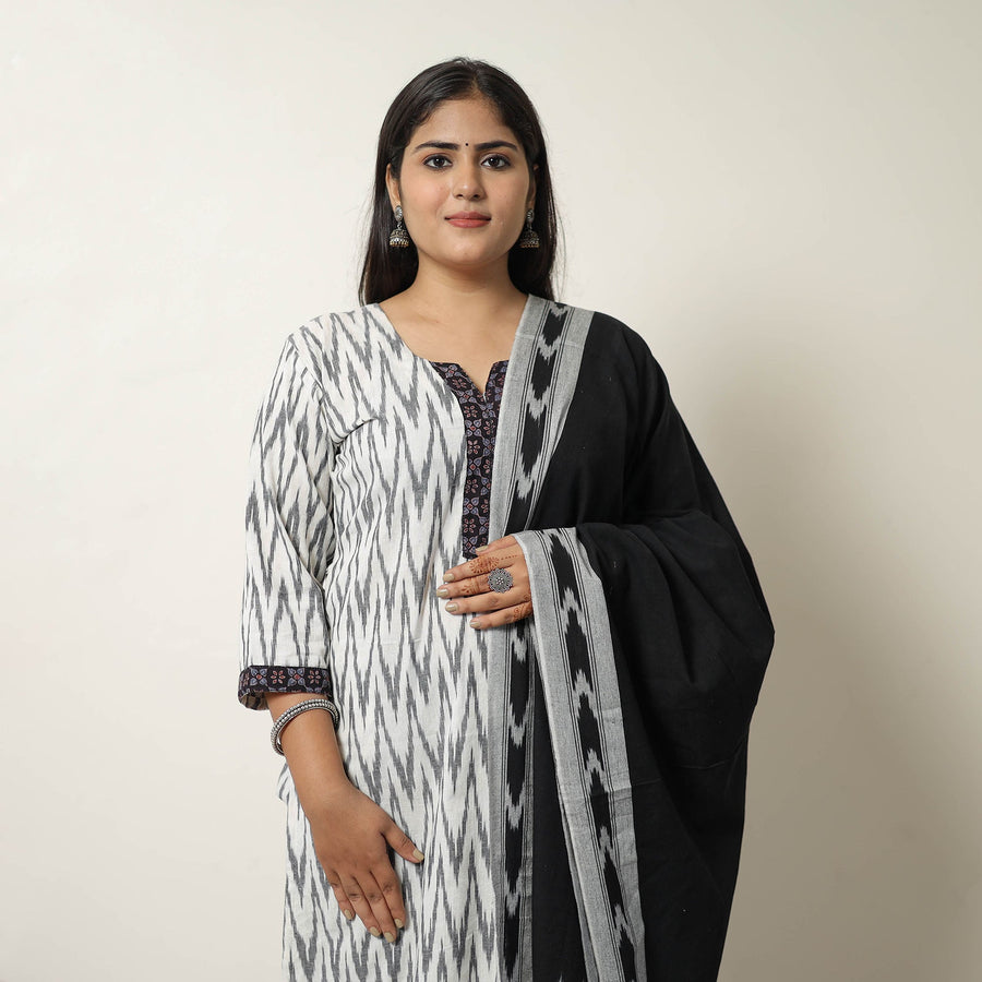 White handloom cotton pochampally ikat kurta set. The set features a stylish kurta with a side pocket, a comfortable palazzo with an elastic waist and two side pockets, and a matching dupatta. This traditional ikat weaving technique from Telangana reflects India's rich textile heritage. This kurta set is perfect for an elegant yet functional look.