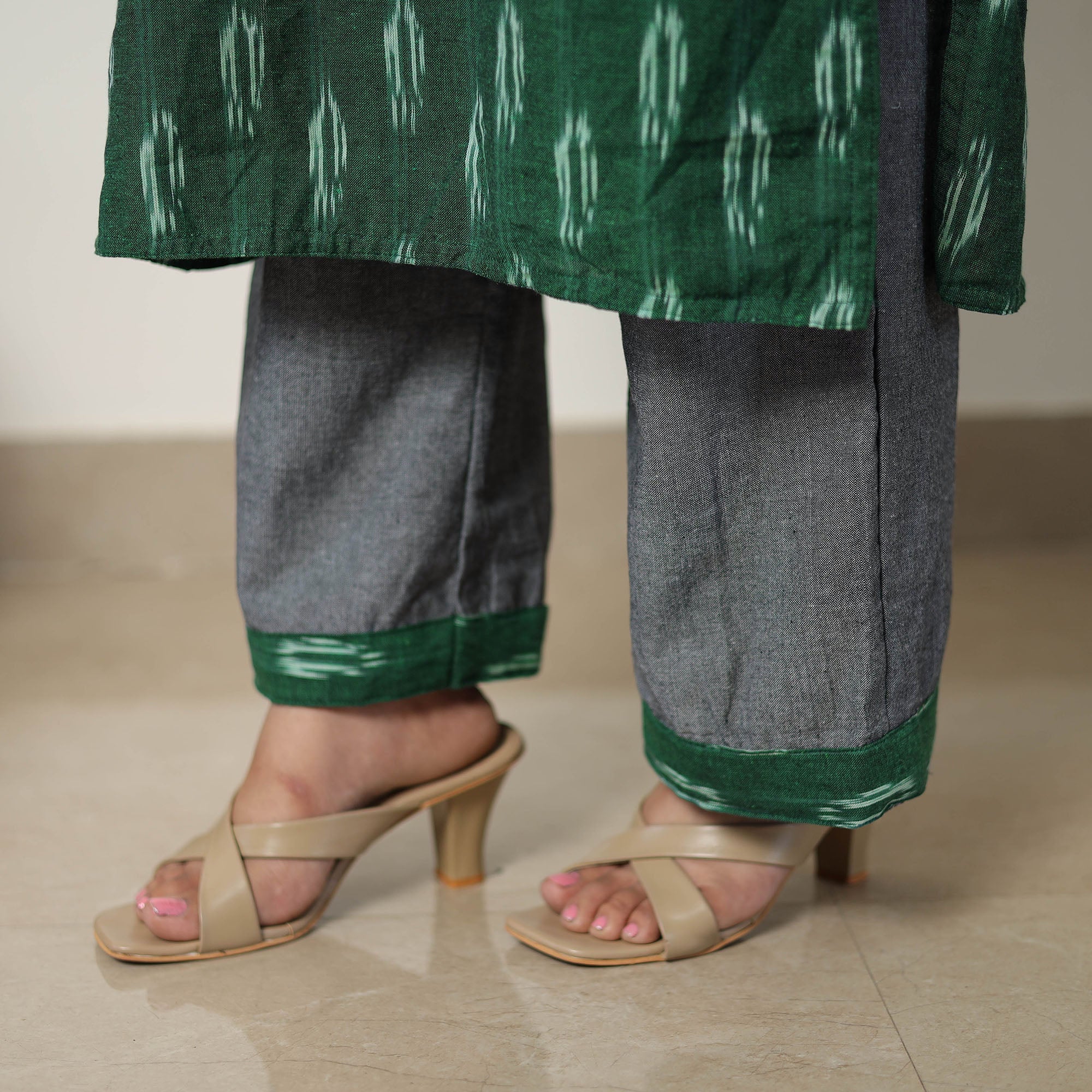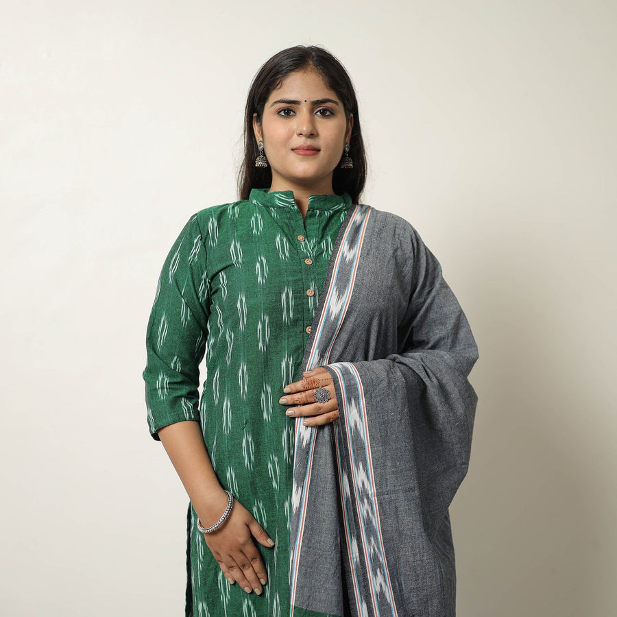 Green handloom cotton pochampally ikat kurta set. The set features a stylish kurta with a side pocket, a comfortable palazzo with an elastic waist and two side pockets, and a matching dupatta. This traditional ikat weaving technique from Telangana reflects India's rich textile heritage. This kurta set is perfect for an elegant yet functional look.