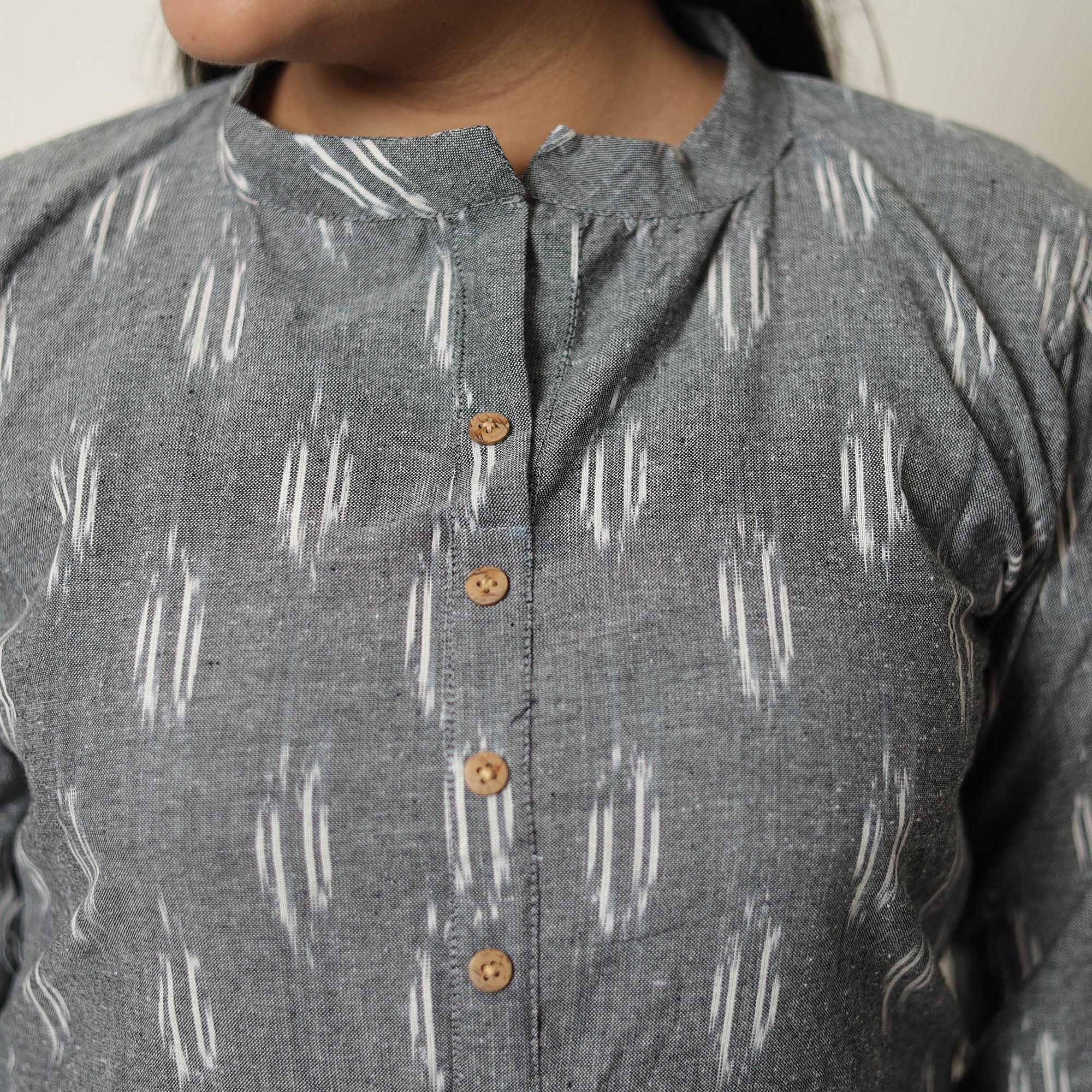 Grey handloom cotton pochampally ikat kurta set. The set features a stylish kurta with a side pocket, a comfortable palazzo with an elastic waist and two side pockets, and a matching dupatta. This traditional ikat weaving technique from Telangana reflects India's rich textile heritage. This kurta set is perfect for an elegant yet functional look.