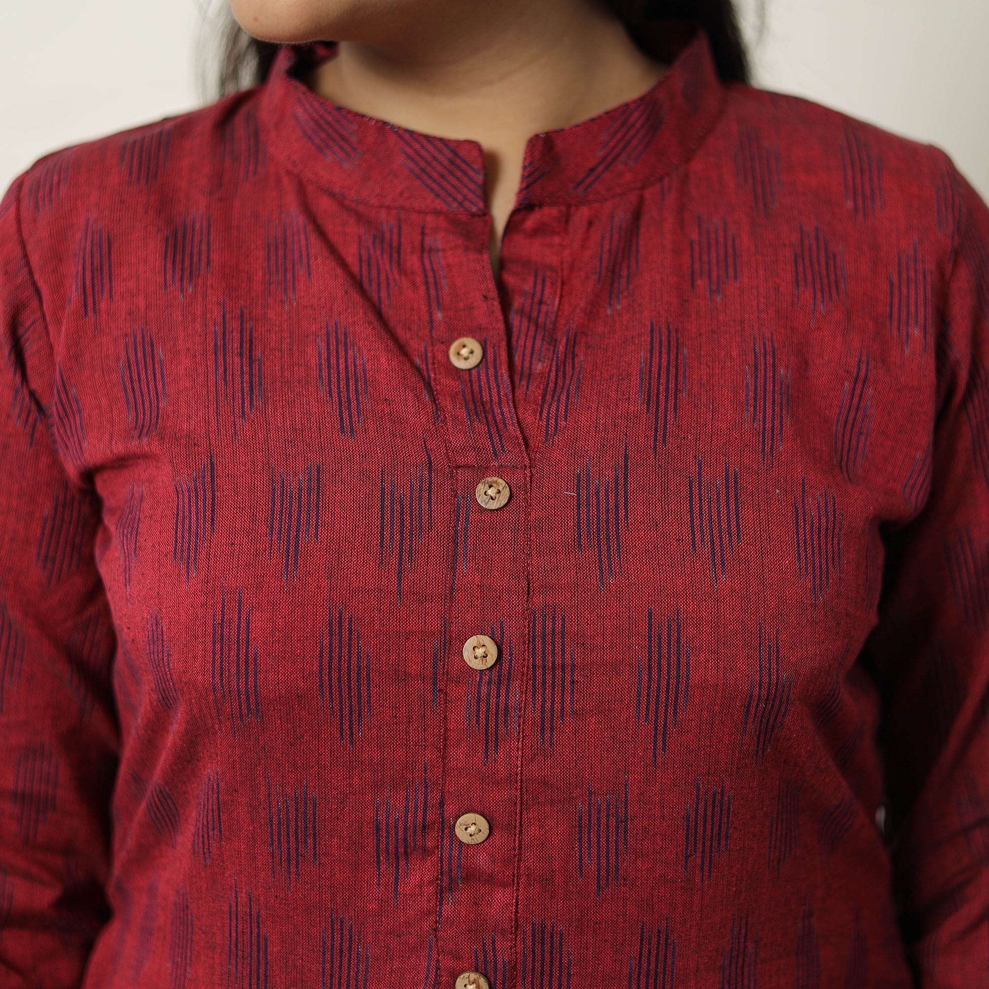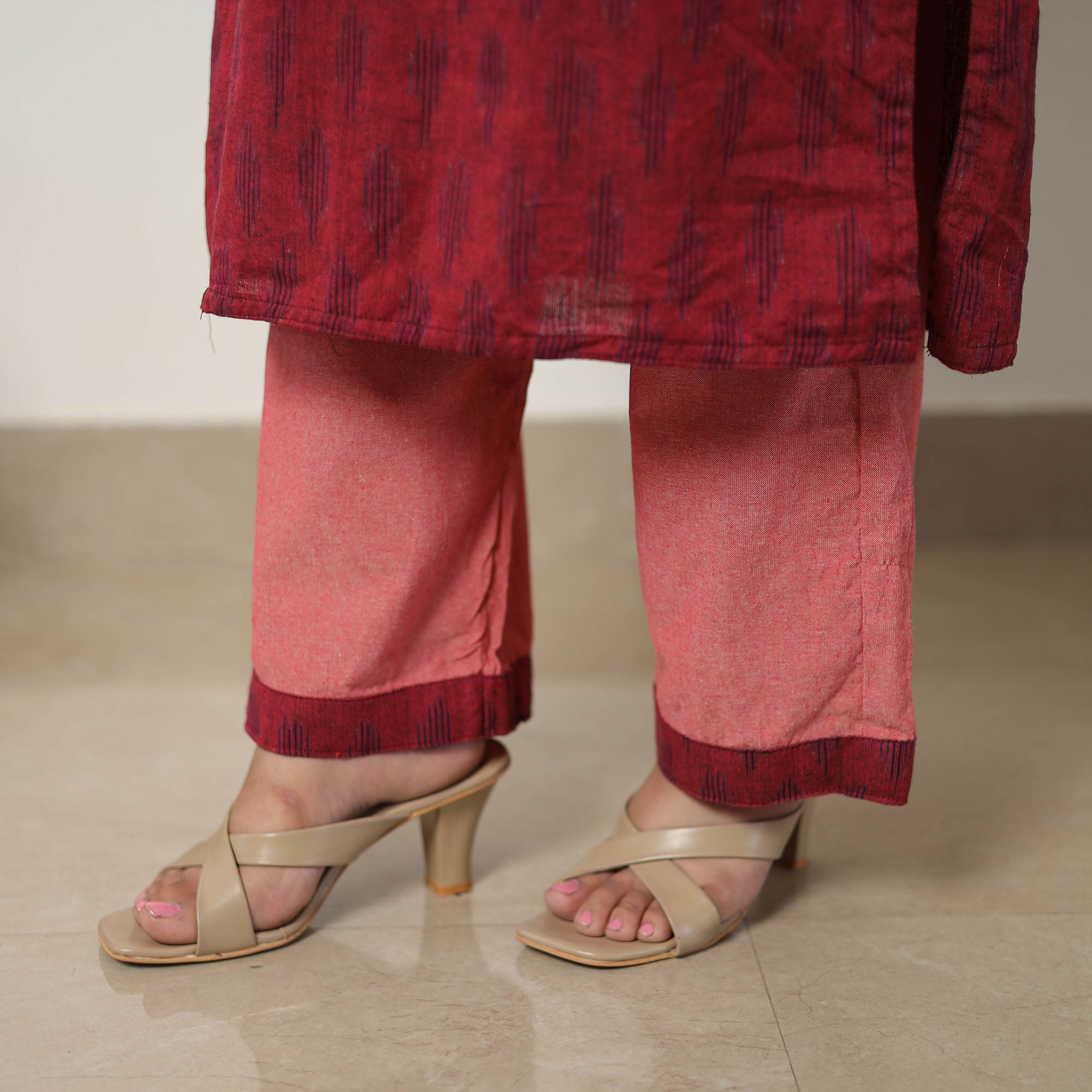 Red handloom cotton pochampally ikat kurta set. The set features a stylish kurta with a side pocket, a comfortable palazzo with an elastic waist and two side pockets, and a matching dupatta. This traditional ikat weaving technique from Telangana reflects India's rich textile heritage. This kurta set is perfect for an elegant yet functional look.