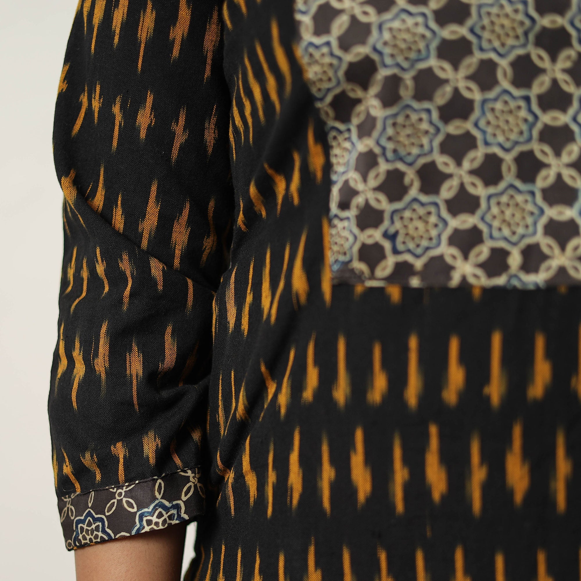 Black handloom cotton pochampally ikat kurta set. The set features a stylish kurta with a side pocket, a comfortable palazzo with an elastic waist and two side pockets, and a matching dupatta. This traditional ikat weaving technique from Telangana reflects India's rich textile heritage. This kurta set is perfect for an elegant yet functional look.