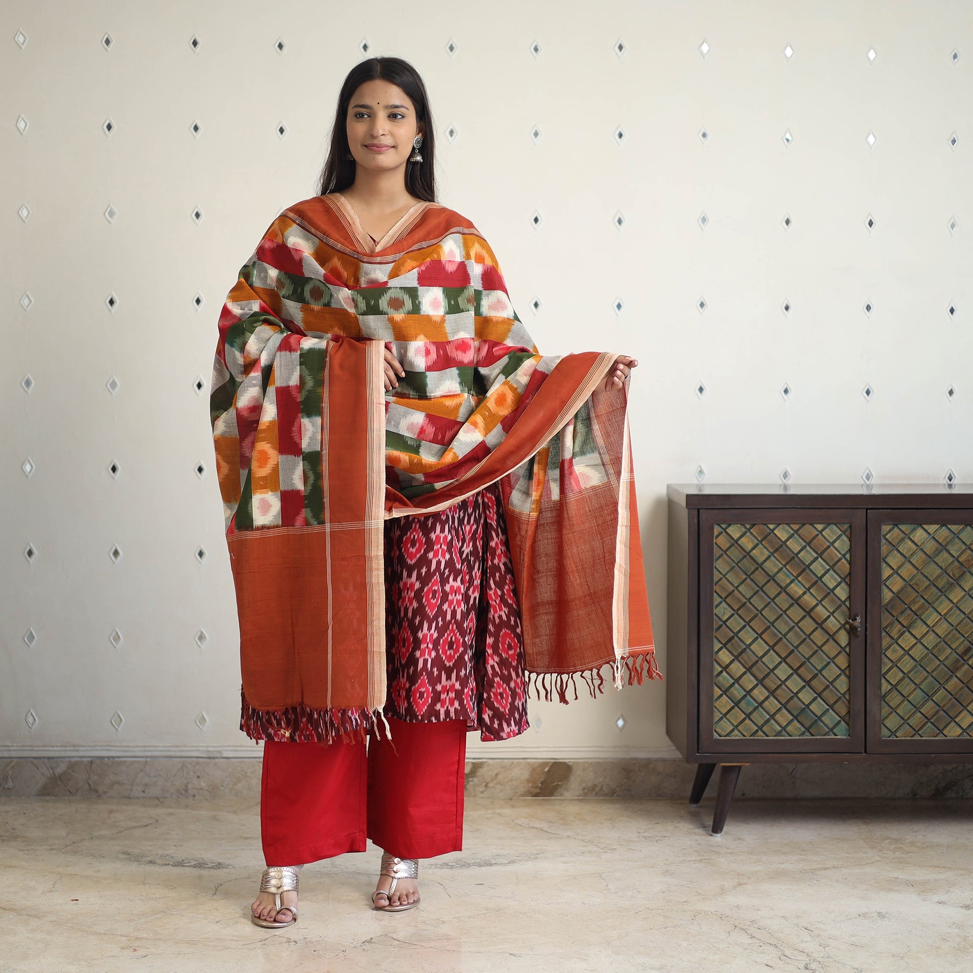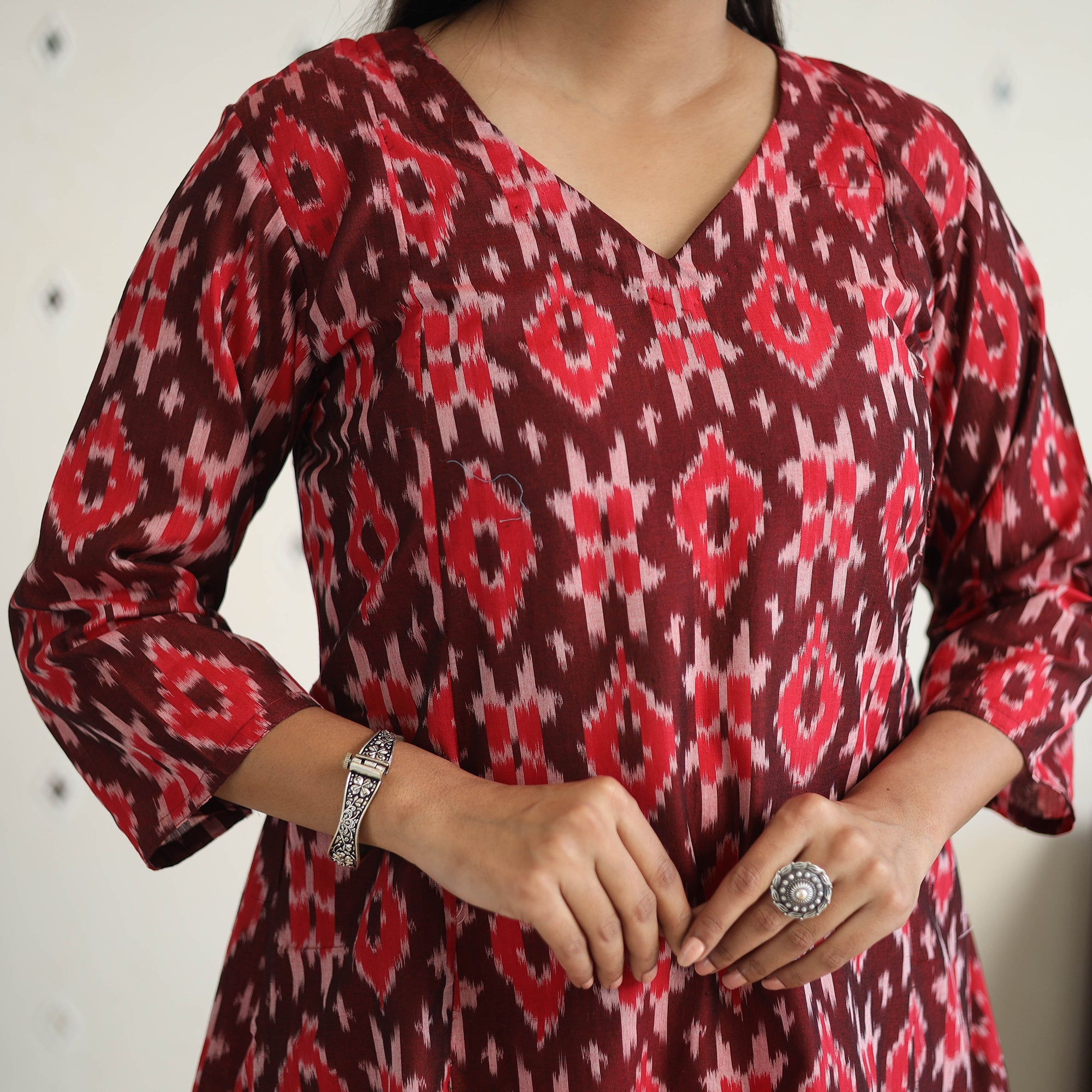 This maroon handloom mercerized cotton pochampally Ikat kurta set highlights the rich weaving heritage of Telangana. It features a comfortable A-line kurta with a side pocket, a matching dupatta, and a plain palazzo with two side pockets and an elasticated waistband. The Ikat technique involves resist-dyeing yarns before weaving, creating intricate patterns. Perfect for everyday wear, work, casual outings, or relaxed get-togethers.