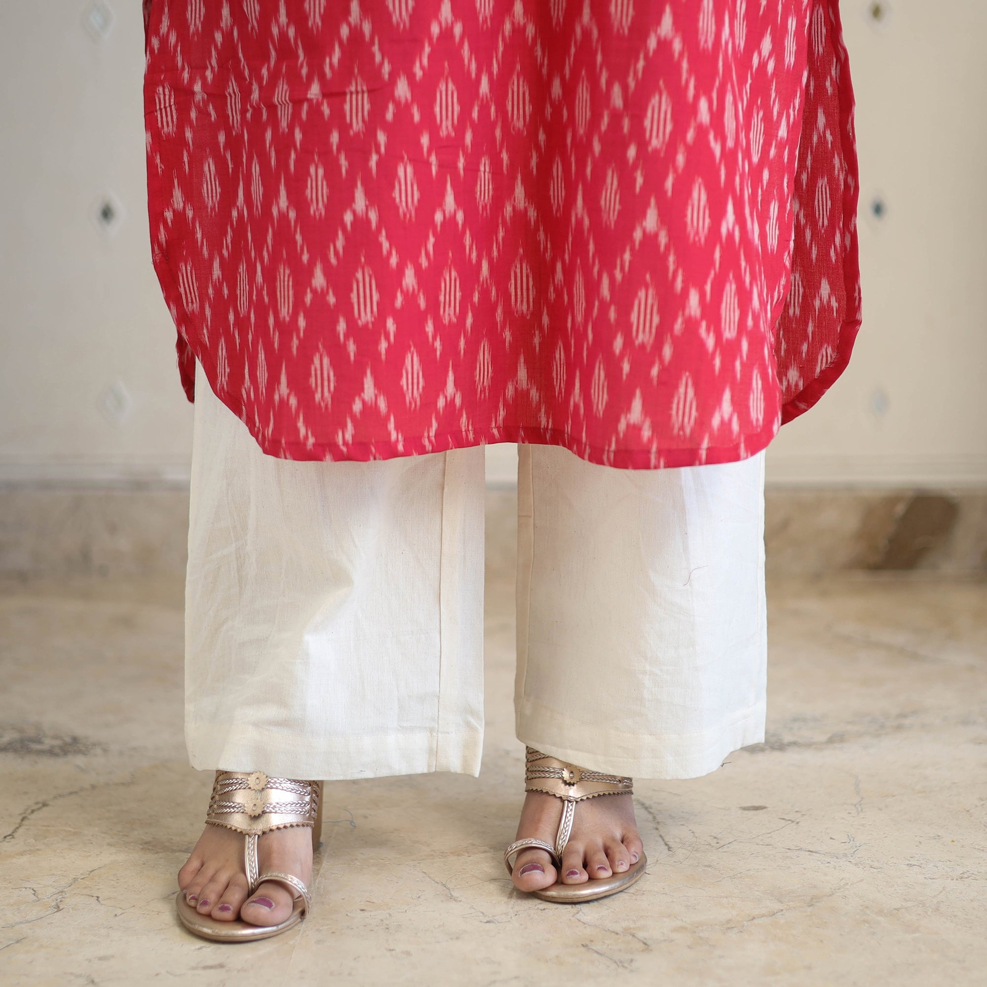 This pink handloom mercerized cotton pochampally Ikat kurta set highlights the traditional weaving artistry of Telangana. It features a comfortable straight-cut kurta with a side pocket, a plain palazzo with two side pockets and an elasticated waistband, and a matching pochampally Ikat dupatta. The Ikat technique, in which yarns are resist-dyed before weaving, creates distinctive and intricate patterns. Perfect for daily wear, office use, casual outings, or relaxed gatherings.