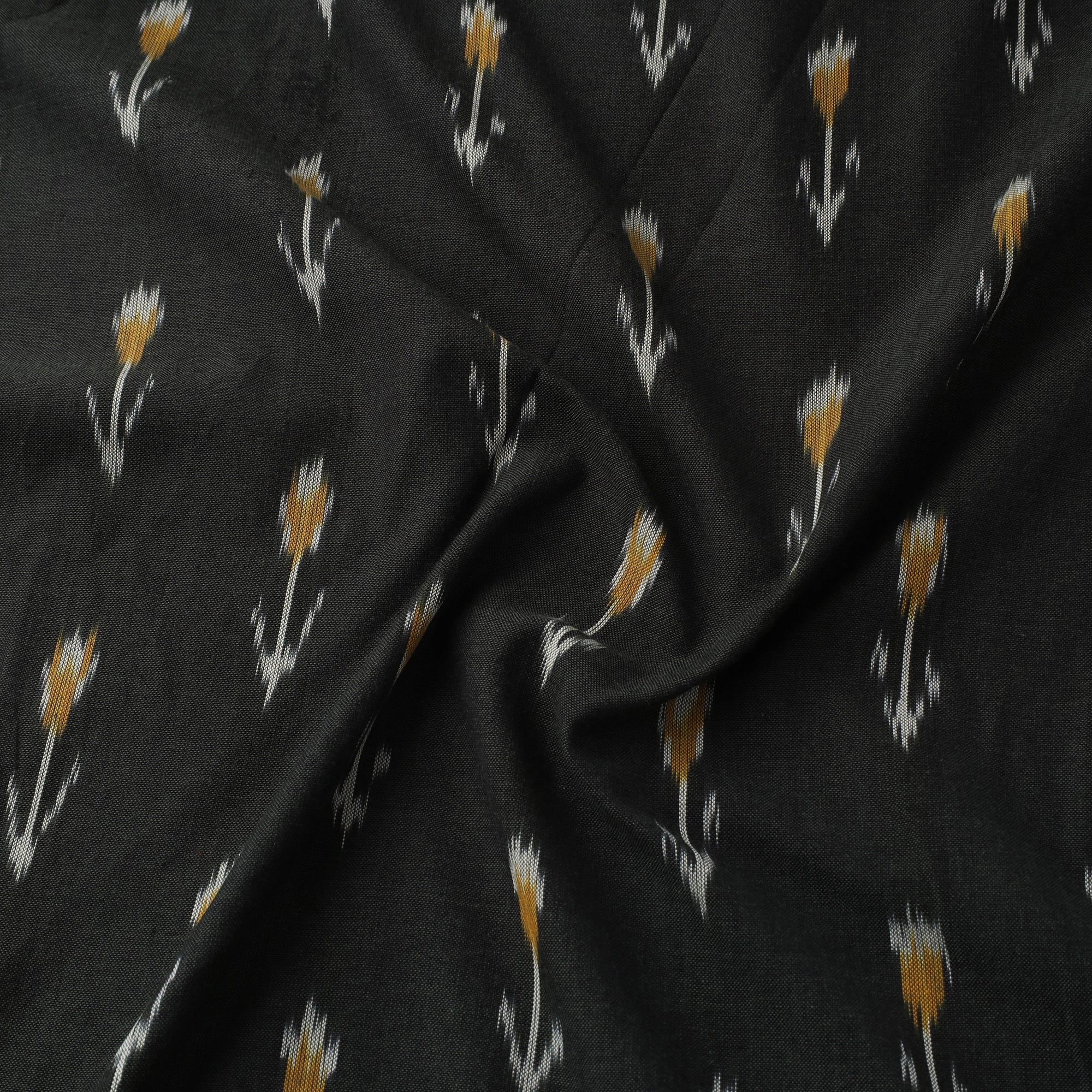 This black cotton pochampally Ikat fabric is a traditional weave from Telangana, admired for its precision and vibrant patterns. Crafted using a resist-dyeing method where the threads are dyed before weaving, it results in sharply defined, geometric motifs. Known for its rich texture and vivid colours, this fabric is ideal for ethnic outfits, home furnishings, or imaginative sewing creations.