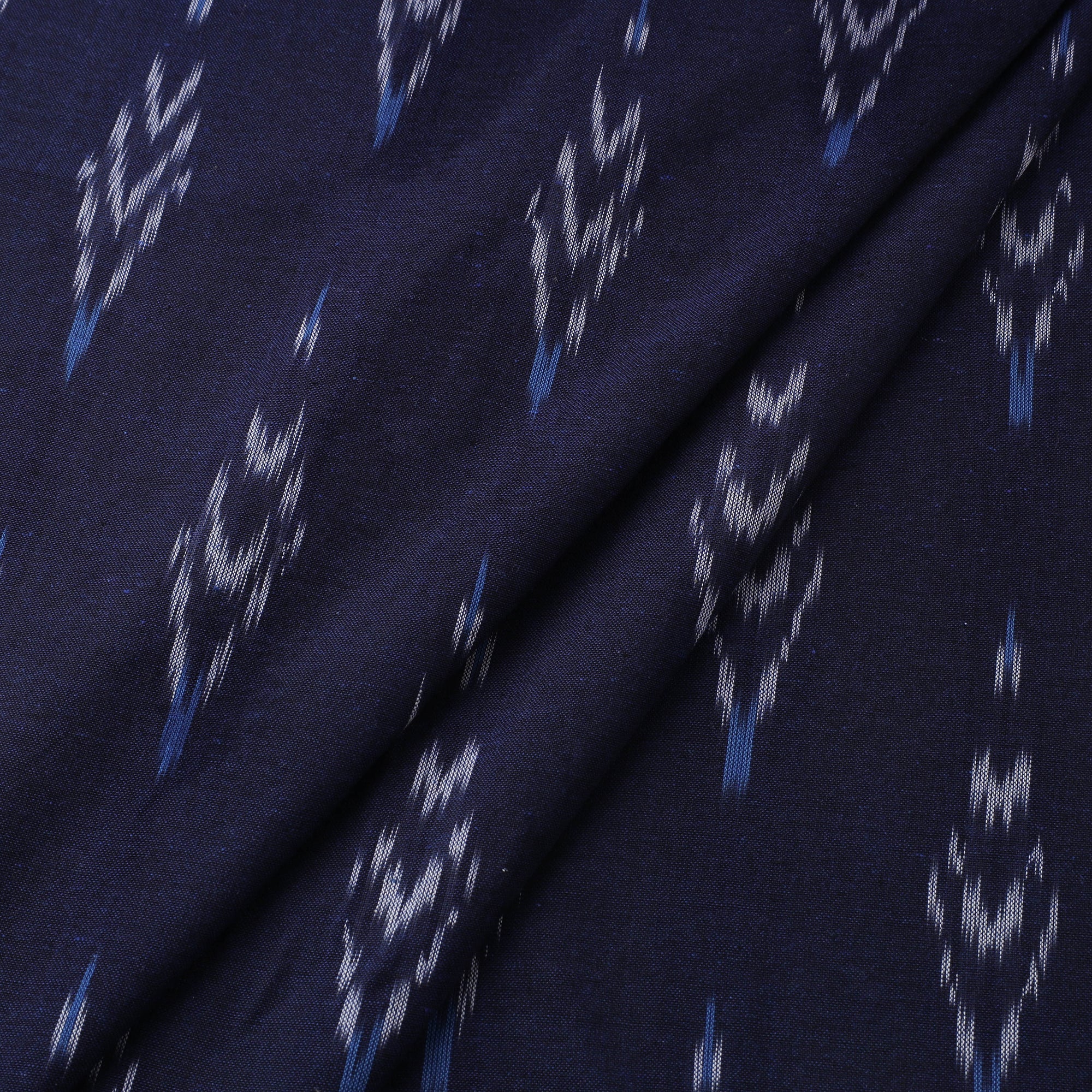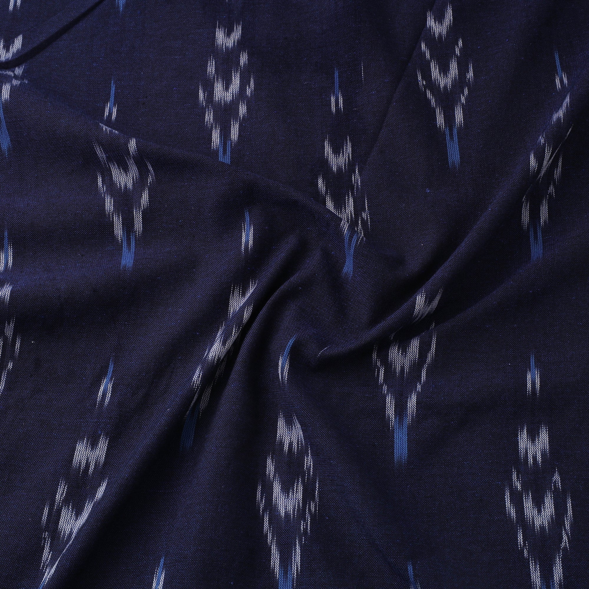 This blue cotton pochampally Ikat fabric is a traditional weave from Telangana, admired for its precision and vibrant patterns. Crafted using a resist-dyeing method where the threads are dyed before weaving, it results in sharply defined, geometric motifs. Known for its rich texture and vivid colours, this fabric is ideal for ethnic outfits, home furnishings, or imaginative sewing creations.