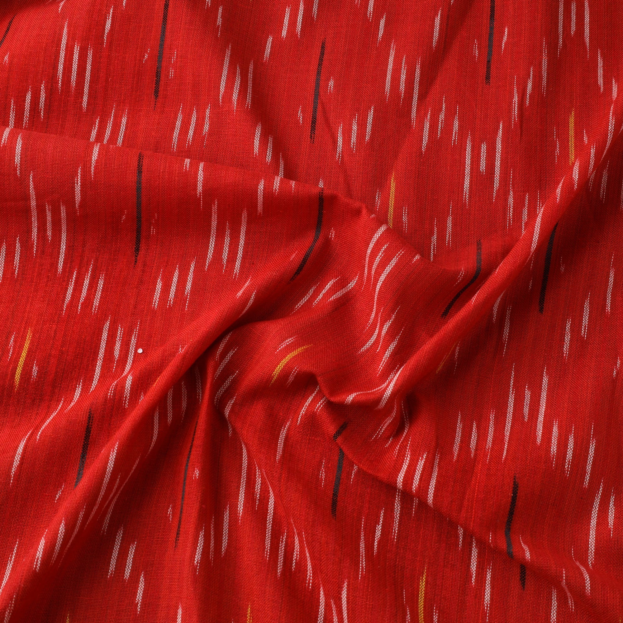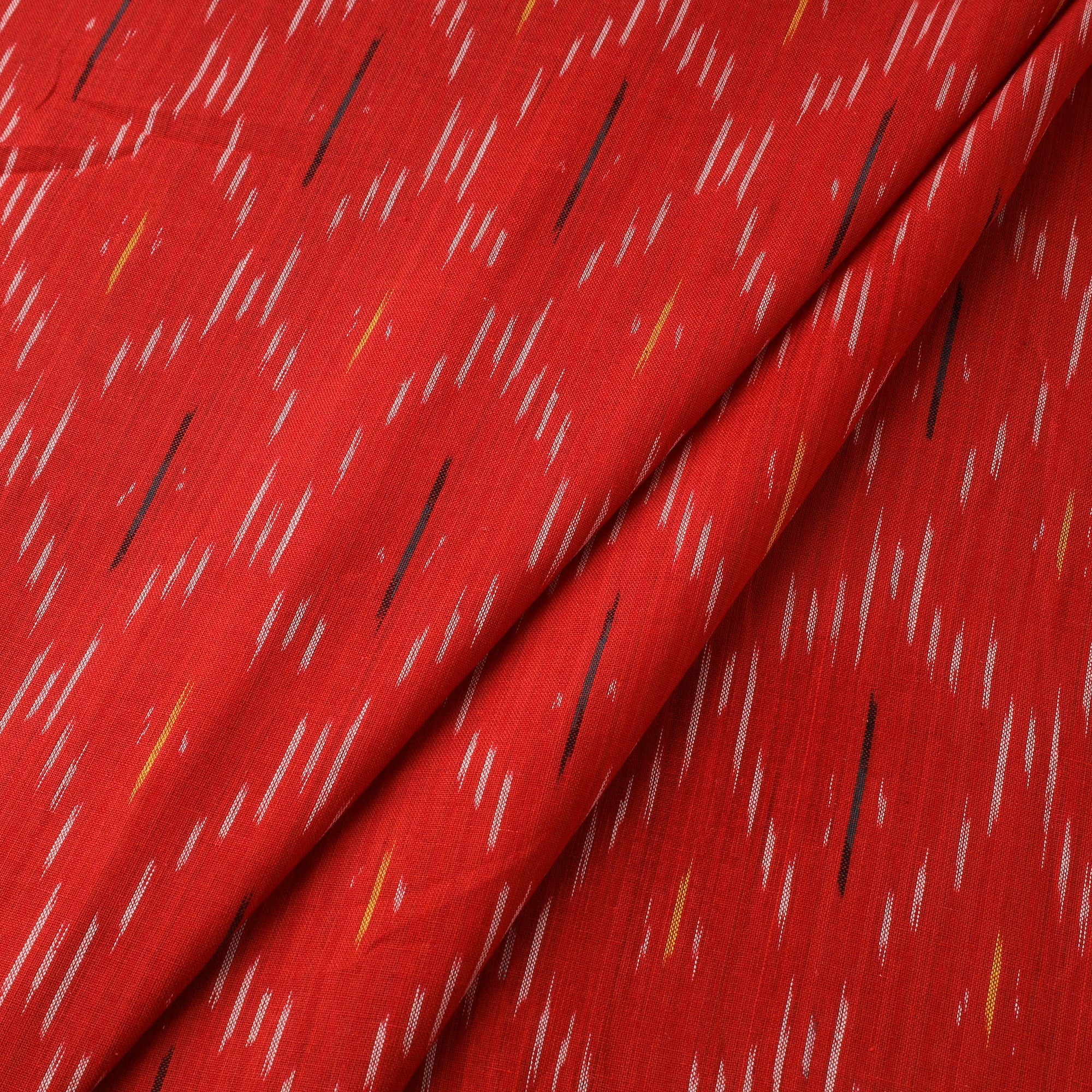 This red cotton pochampally Ikat fabric is a traditional weave from Telangana, admired for its precision and vibrant patterns. Crafted using a resist-dyeing method where the threads are dyed before weaving, it results in sharply defined, geometric motifs. Known for its rich texture and vivid colours, this fabric is ideal for ethnic outfits, home furnishings, or imaginative sewing creations.