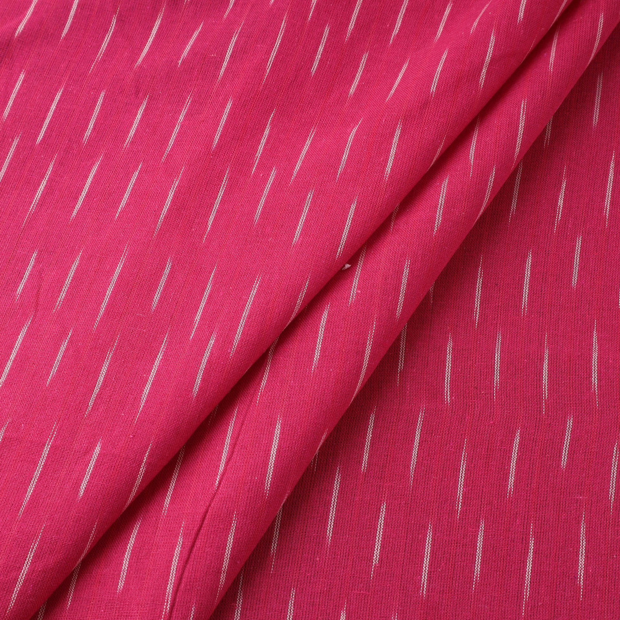 This pink cotton pochampally Ikat fabric is a traditional weave from Telangana, admired for its precision and vibrant patterns. Crafted using a resist-dyeing method where the threads are dyed before weaving, it results in sharply defined, geometric motifs. Known for its rich texture and vivid colours, this fabric is ideal for ethnic outfits, home furnishings, or imaginative sewing creations.