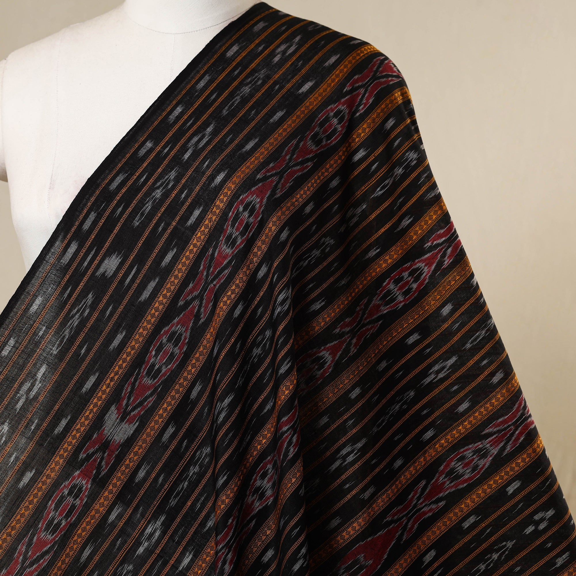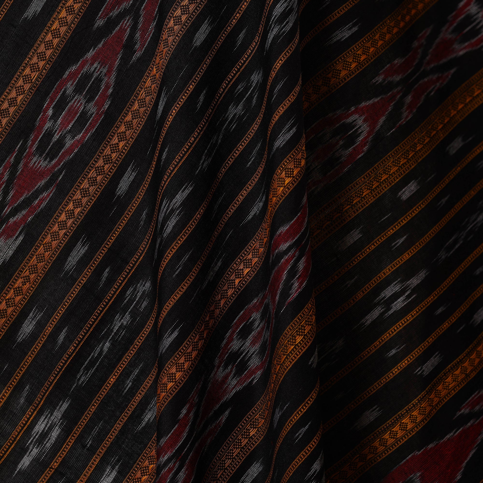 This black handloom cotton sambalpuri Ikat fabric is meticulously woven by skilled artisans from Odisha, using the age-old resist dyeing method applied to both warp and weft threads. Known for its intricate motifs and deep cultural symbolism, the fabric reflects the timeless heritage of Eastern India’s weaving traditions. Perfect for creating kurtas, dresses, or distinctive home décor accents.