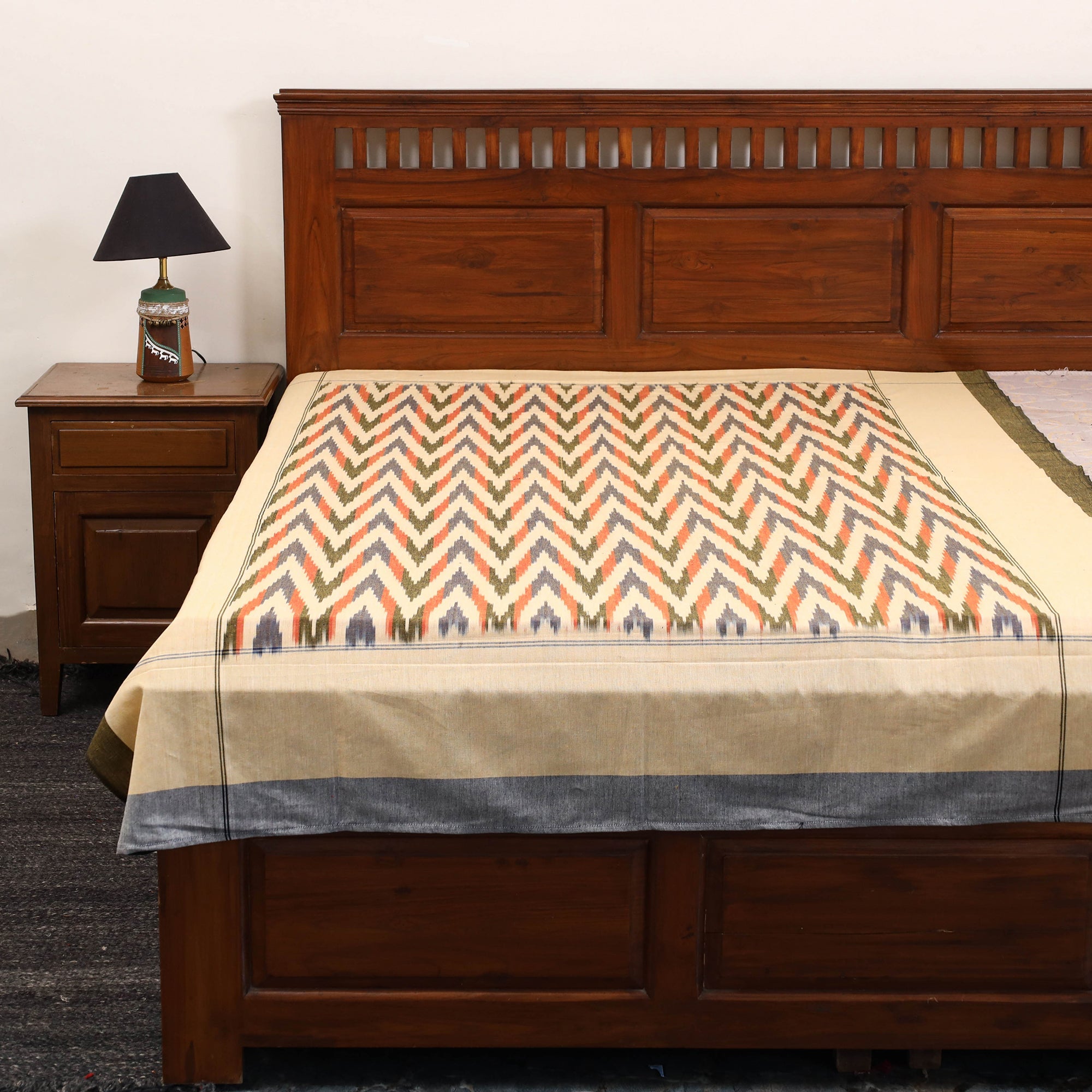 Handloom cotton pochampally ikat bed sheet, crafted by skilled artisans. The Ikat technique involves resist dyeing the yarns before weaving, creating intricate and unique patterns. This single bed sheet is perfect for adding a traditional touch to your bedroom.