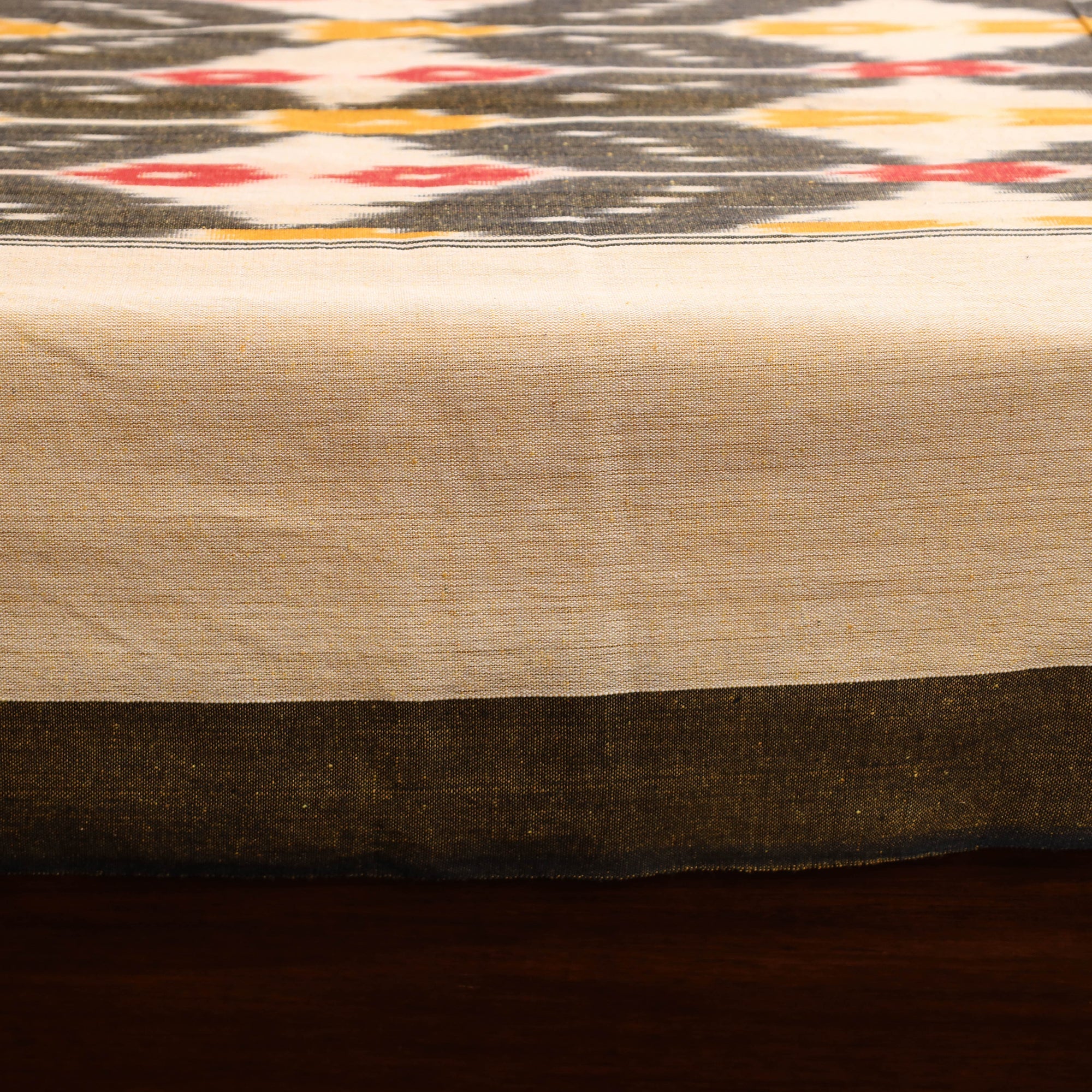 Handloom cotton pochampally ikat bed sheet, crafted by skilled artisans. The Ikat technique involves resist dyeing the yarns before weaving, creating intricate and unique patterns. This single bed sheet is perfect for adding a traditional touch to your bedroom.