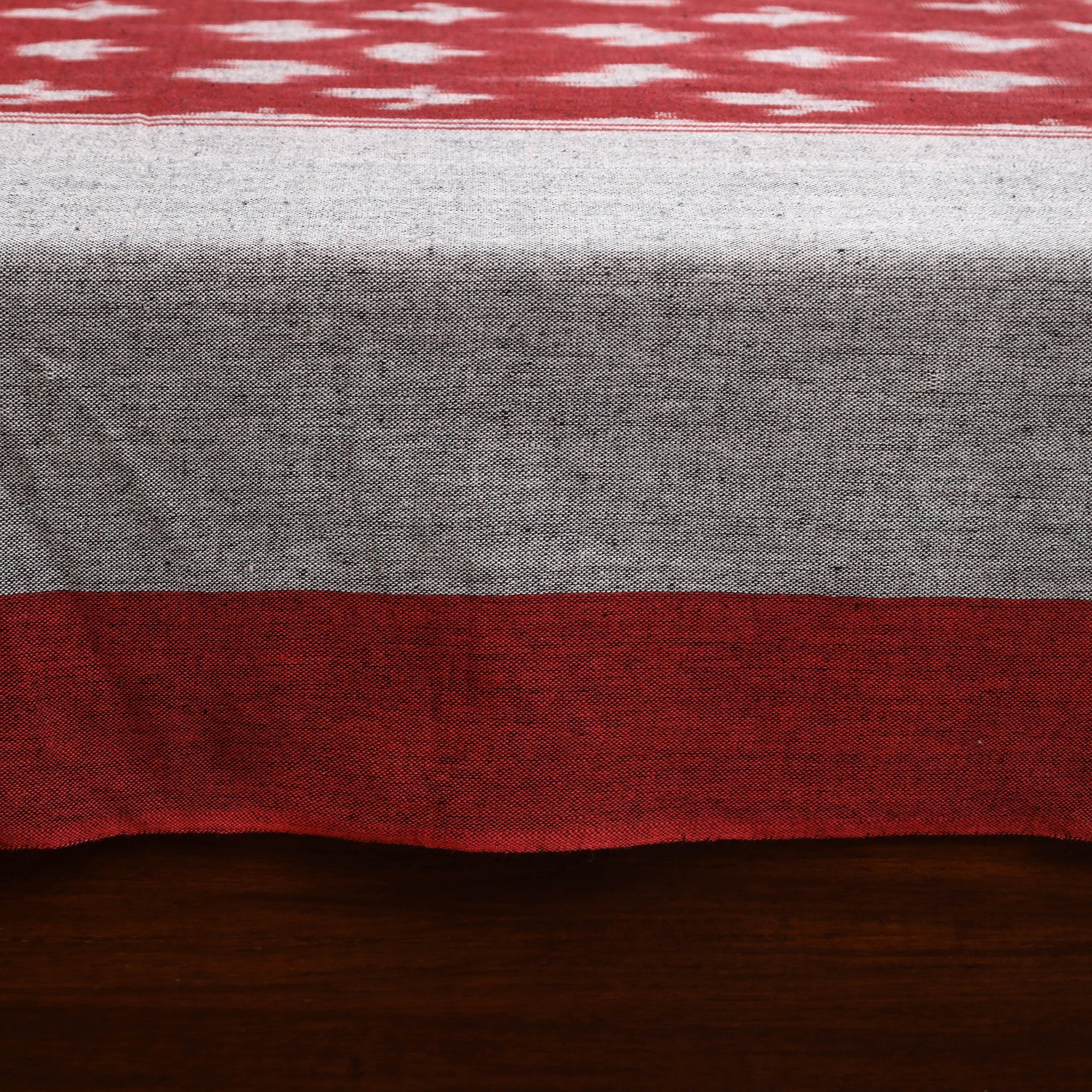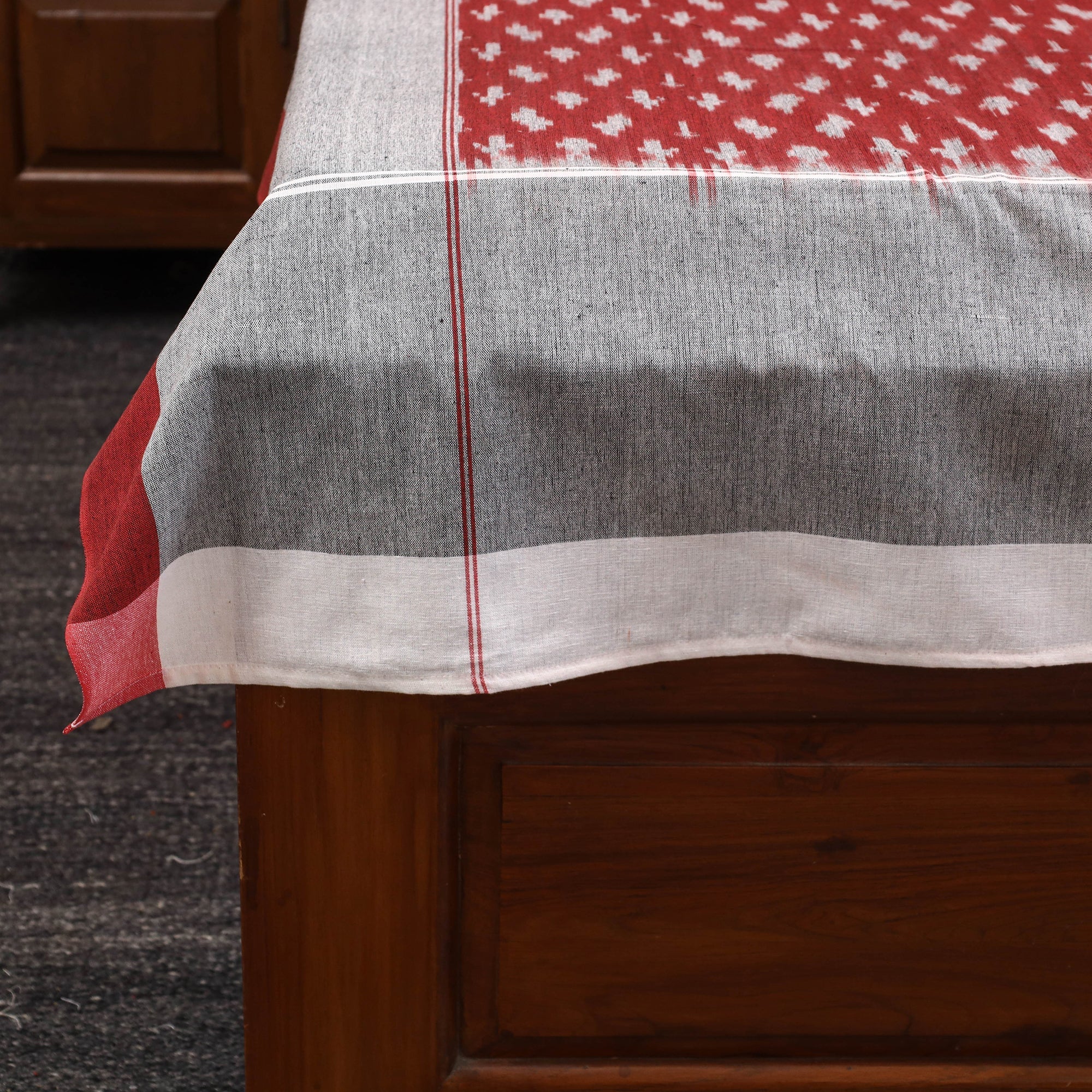 Handloom cotton pochampally ikat bed sheet, crafted by skilled artisans. The Ikat technique involves resist dyeing the yarns before weaving, creating intricate and unique patterns. This single bed sheet is perfect for adding a traditional touch to your bedroom.