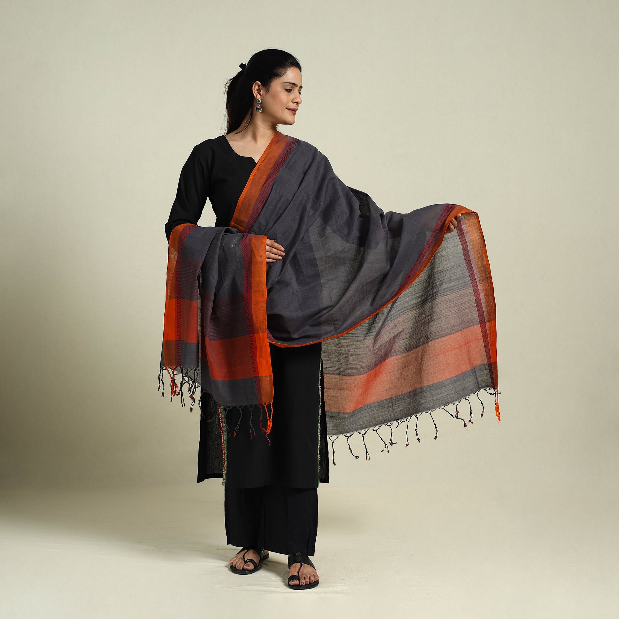 This grey srikakulam jamdani cotton dupatta beautifully showcases the rich textile heritage of Andhra Pradesh. Crafted from soft, breathable cotton, it features intricate jamdani motifs, skillfully woven using the supplementary weft technique. Delicate tassels add a graceful touch, making this dupatta a perfect blend of tradition and modern versatility. Whether paired with suits, kurtas, or dresses, it effortlessly elevates any look with its refined elegance.