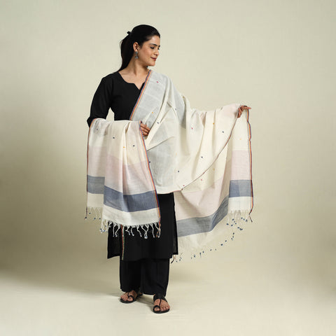 This white srikakulam jamdani cotton dupatta beautifully showcases the rich textile heritage of Andhra Pradesh. Crafted from soft, breathable cotton, it features intricate jamdani motifs, skillfully woven using the supplementary weft technique. Delicate tassels add a graceful touch, making this dupatta a perfect blend of tradition and modern versatility. Whether paired with suits, kurtas, or dresses, it effortlessly elevates any look with its refined elegance.