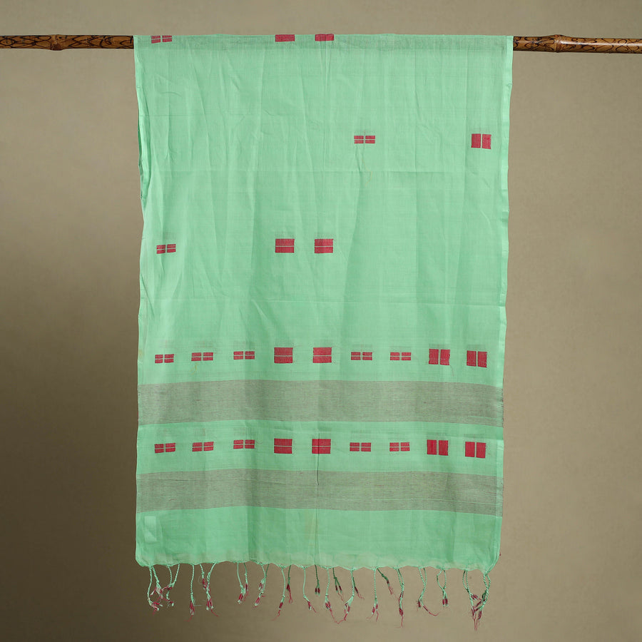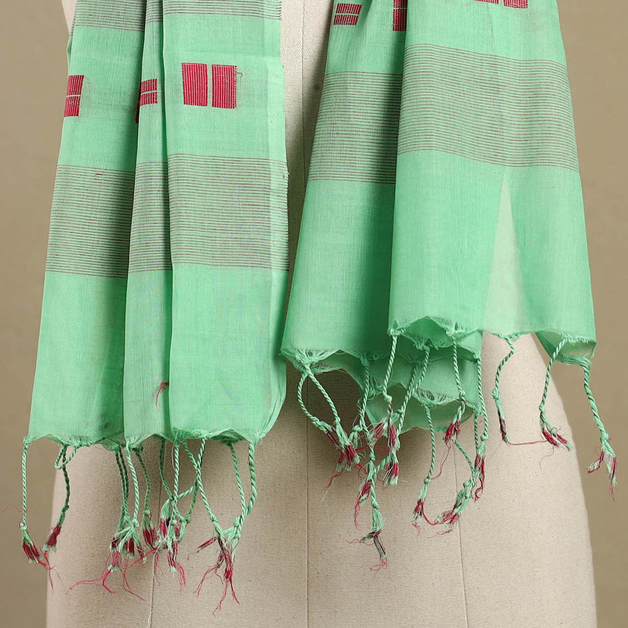 This srikakulam green jamdani cotton stole with tassels beautifully reflects the rich textile heritage of Andhra Pradesh. Woven from soft, breathable cotton, it features intricate jamdani motifs skillfully crafted using the supplementary weft technique. Adorned with delicate tassels, this stole seamlessly blends tradition with modern versatility, making it an elegant accessory for both ethnic and contemporary ensembles.