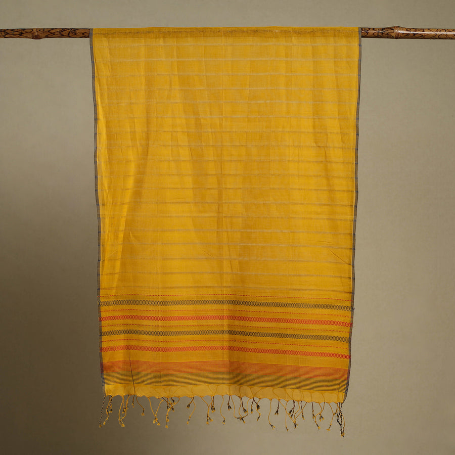This srikakulam yellow jamdani cotton stole with tassels beautifully reflects the rich textile heritage of Andhra Pradesh. Woven from soft, breathable cotton, it features intricate jamdani motifs skillfully crafted using the supplementary weft technique. Adorned with delicate tassels, this stole seamlessly blends tradition with modern versatility, making it an elegant accessory for both ethnic and contemporary ensembles.