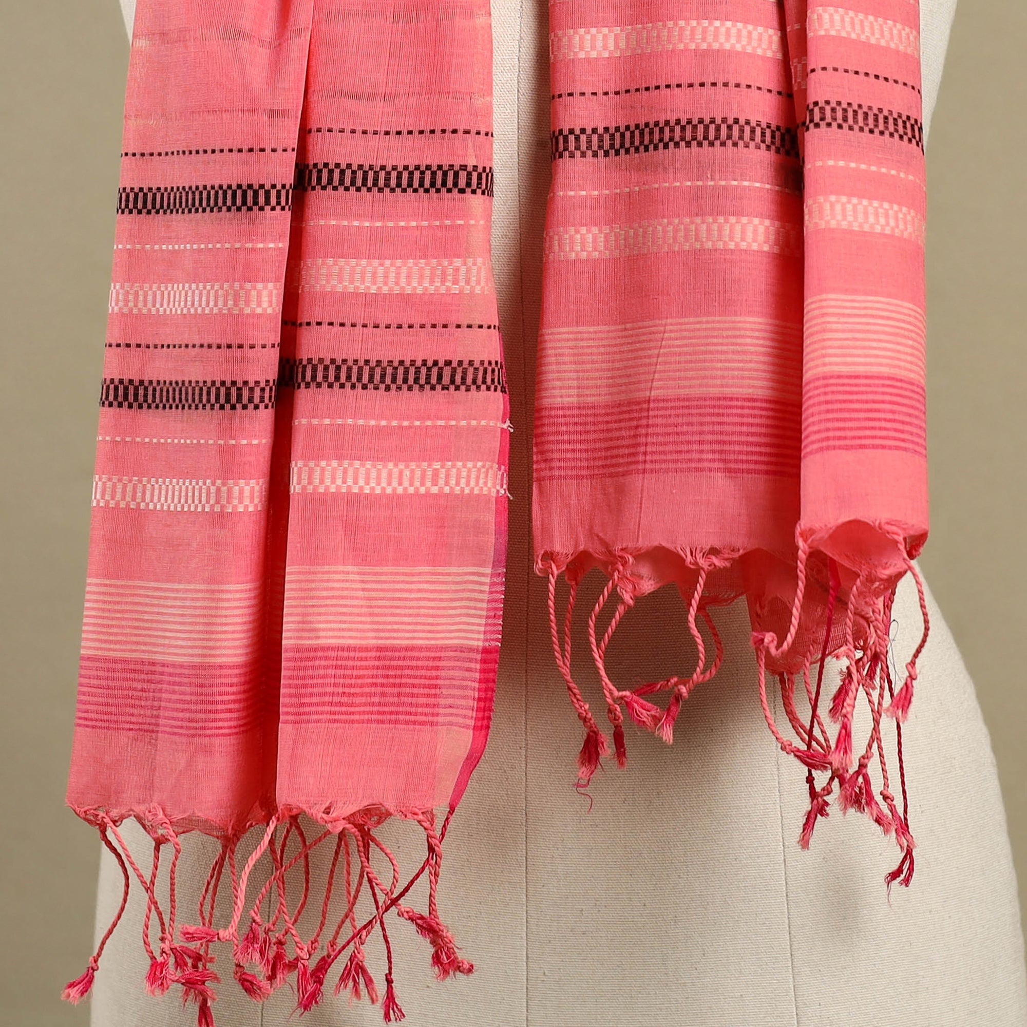 This srikakulam pink jamdani cotton stole with tassels beautifully reflects the rich textile heritage of Andhra Pradesh. Woven from soft, breathable cotton, it features intricate jamdani motifs skillfully crafted using the supplementary weft technique. Adorned with delicate tassels, this stole seamlessly blends tradition with modern versatility, making it an elegant accessory for both ethnic and contemporary ensembles.